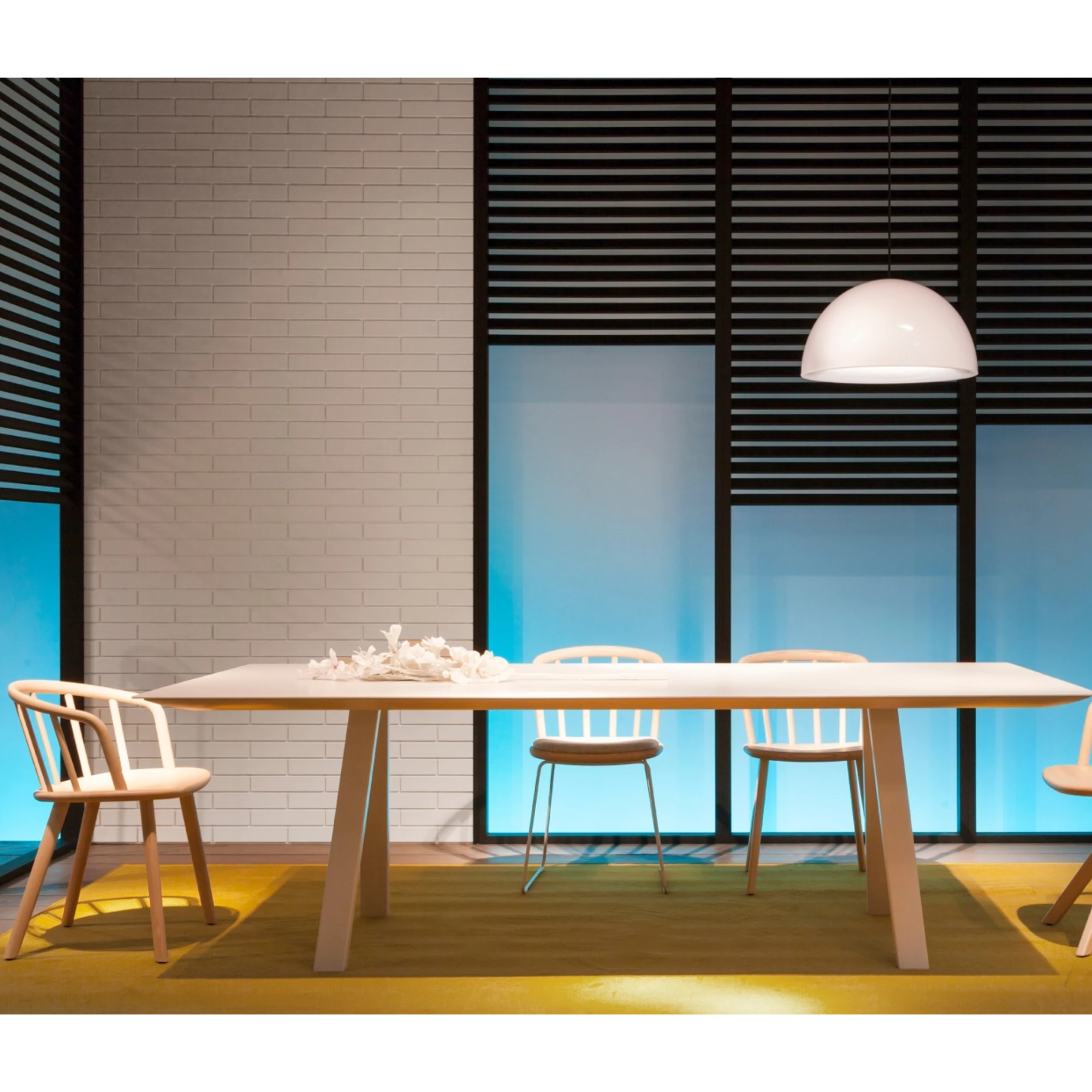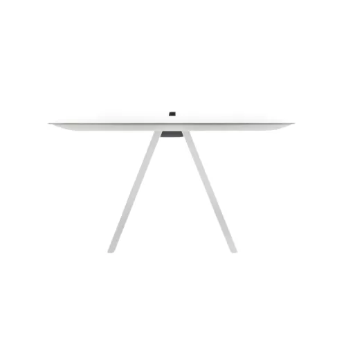 Tisch mit robusten Trestle-Beinen aus Stahl und einer Tischplatte, die von einem Rahmen aus extrudiertem Aluminium getragen wird. Die Materialkombination sorgt für Stabilität und einen modernen Industrie-Look.