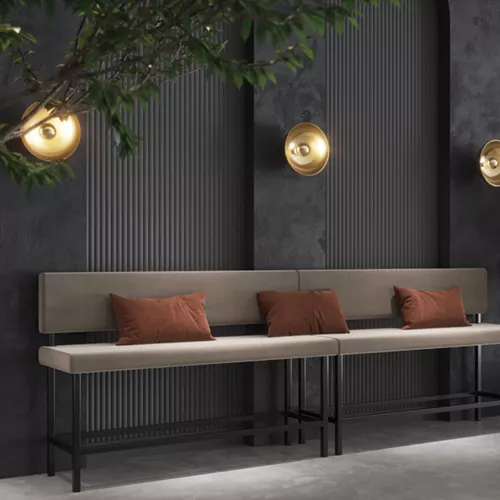 Die Arthur-Bank ist eine hohe Dinerbank mit Metallrahmen, ideal für den Gastronomiebereich. Sie ist in vielen Farben und Dekoren erhältlich und wird individuell nach Ihren Maßangaben gefertigt. Die modulare Polsterbank ist in variablen Größen verfügbar und kann mit zahlreichen Stoffen oder Kunstleder bezogen werden. Sitztiefe: 39 cm. Preis pro Meter.