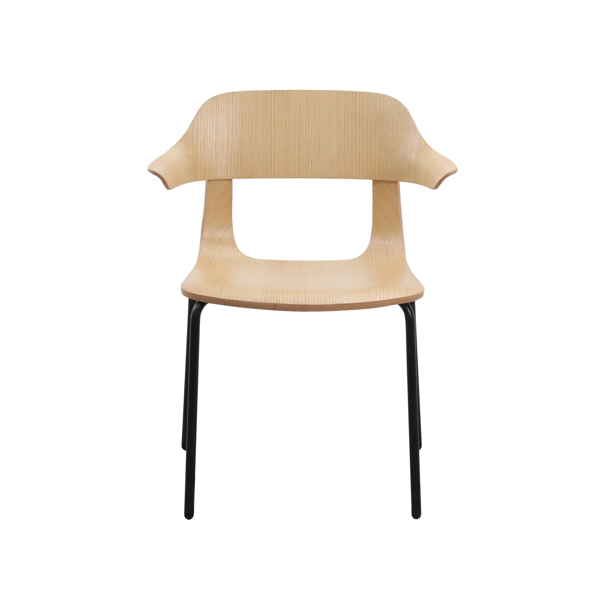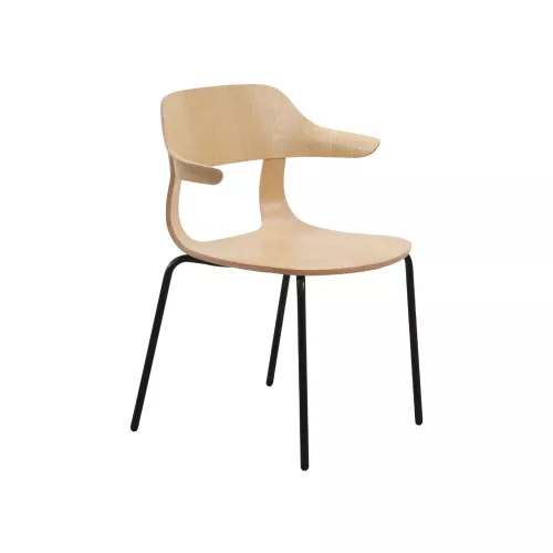 Eleganter Eichenstuhl mit sanft geschwungener Sitzschale und offenen Armlehnen. Getragen von vier schlanken Beinen aus Holz oder Metall, eignet er sich perfekt für moderne Gastronomiebereiche mit Fokus auf Design und Komfort.