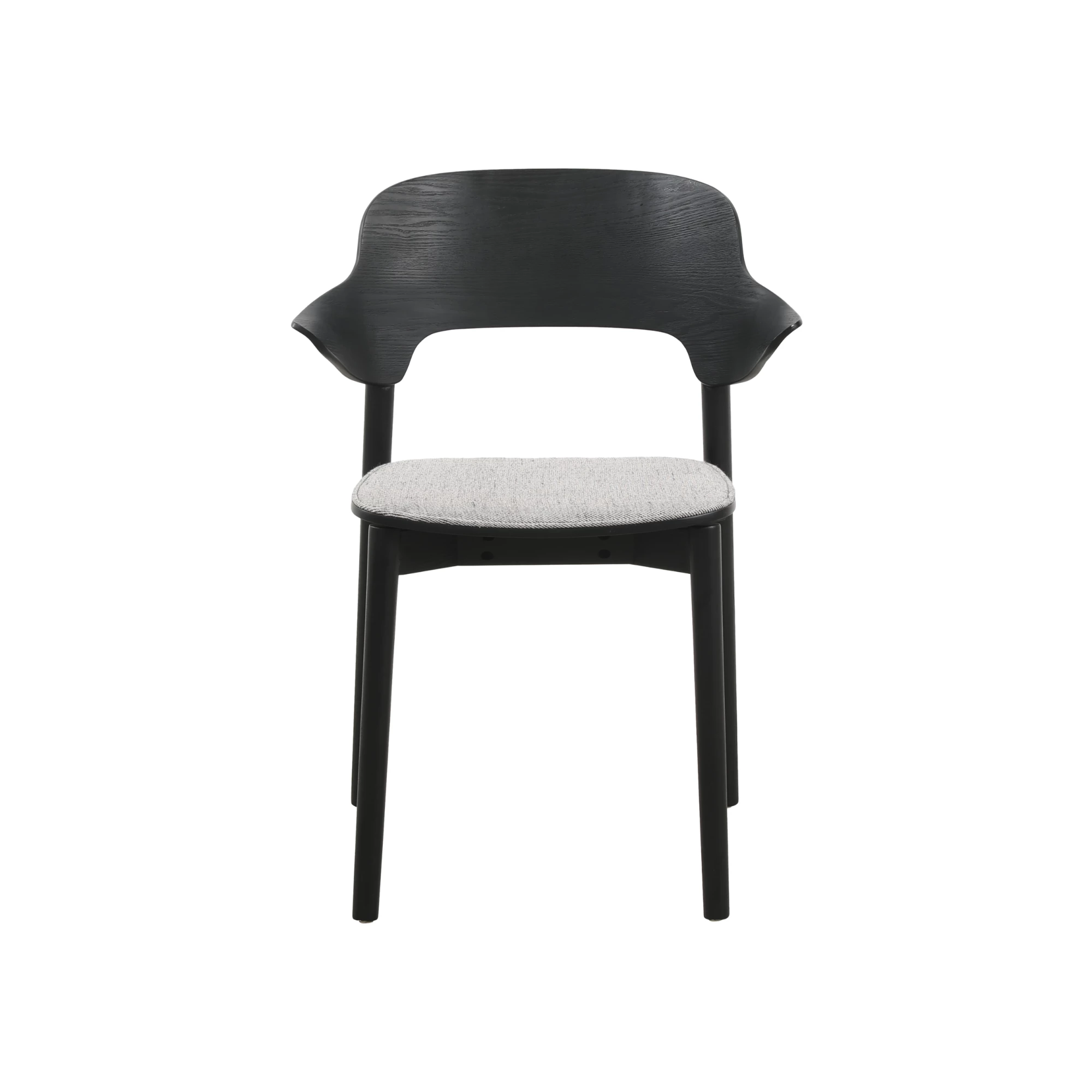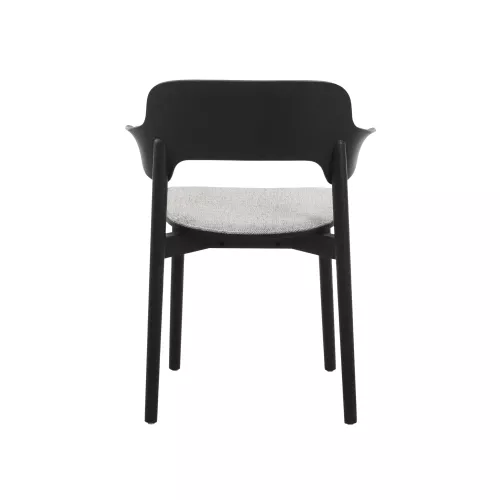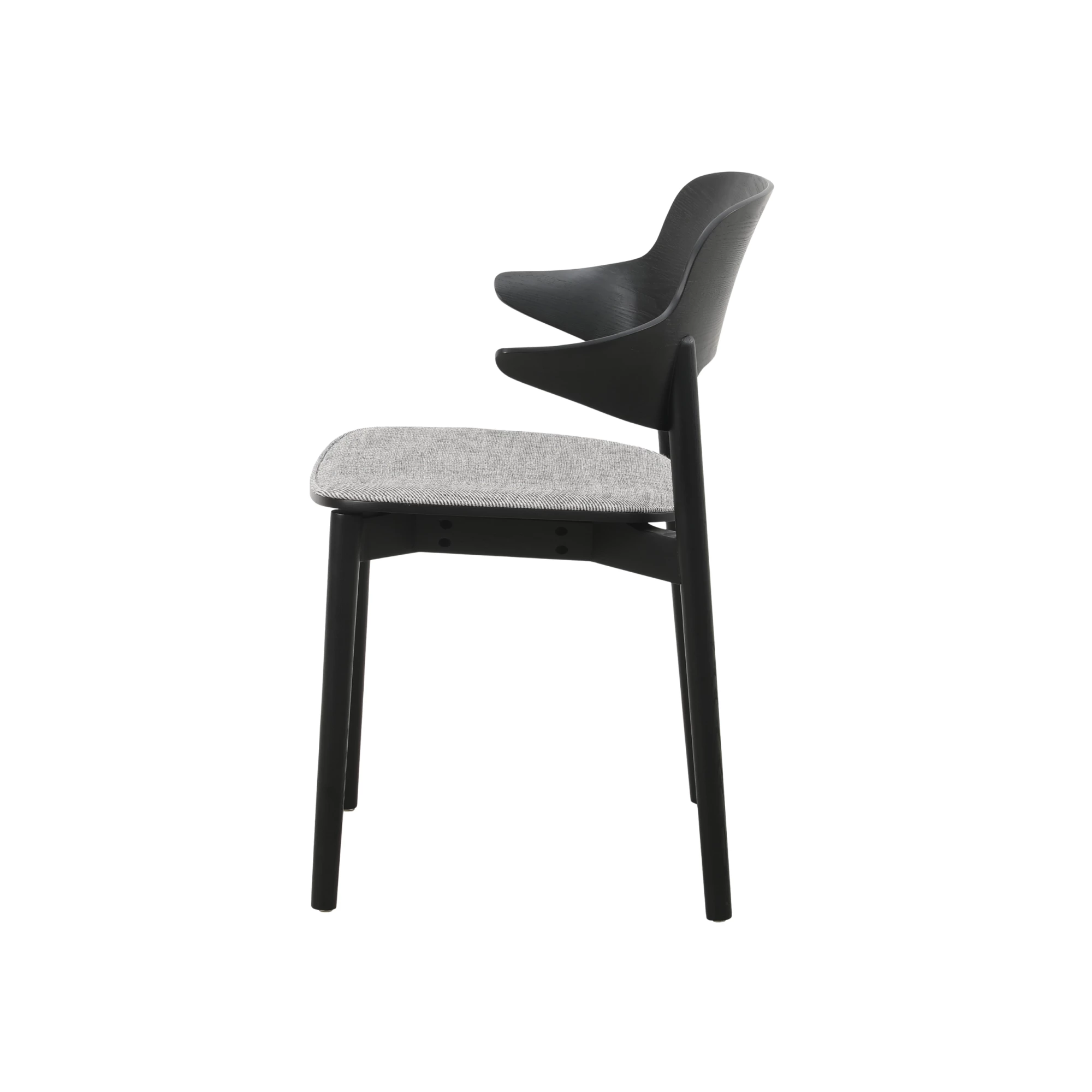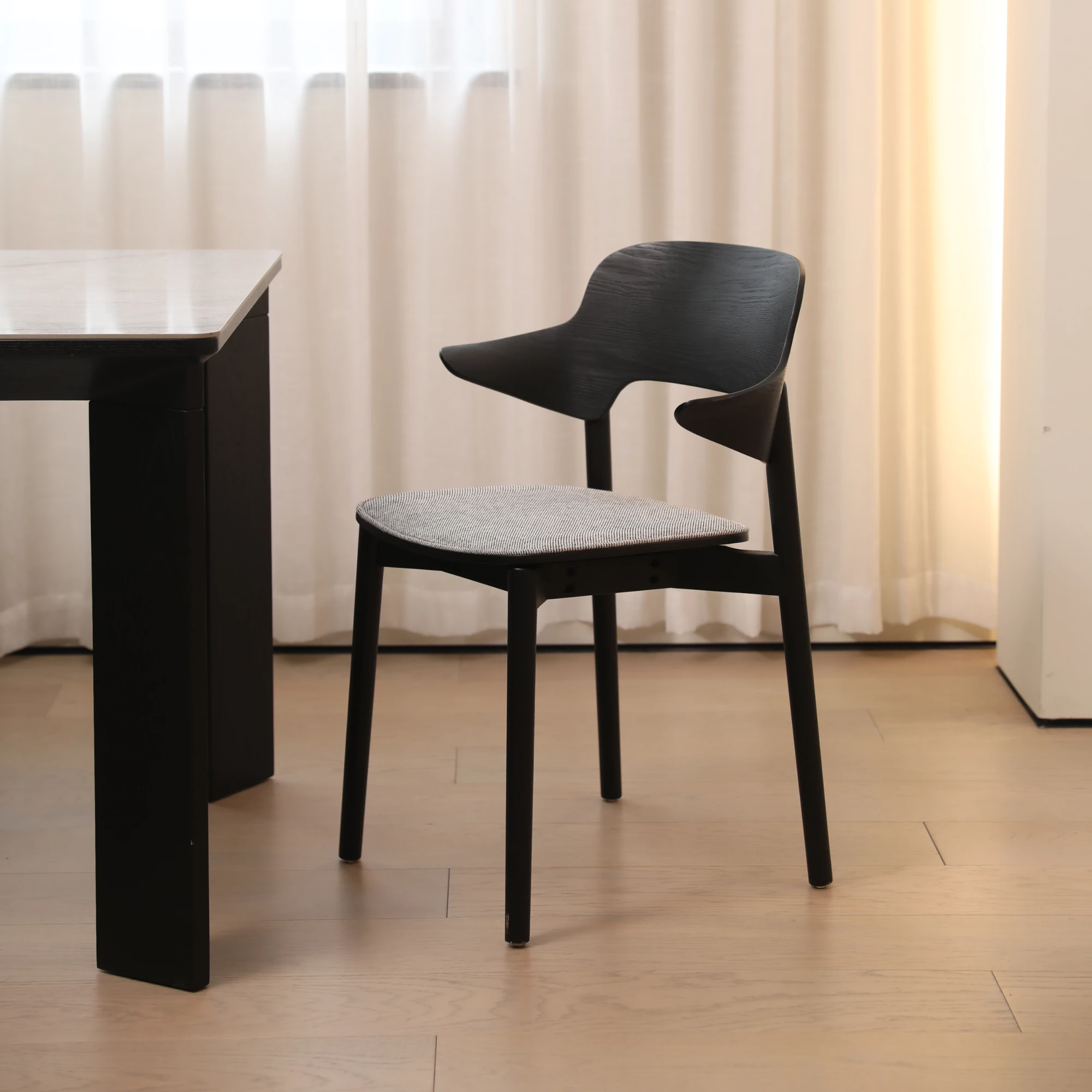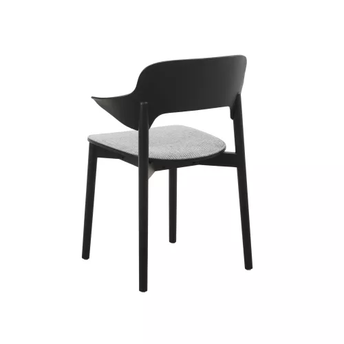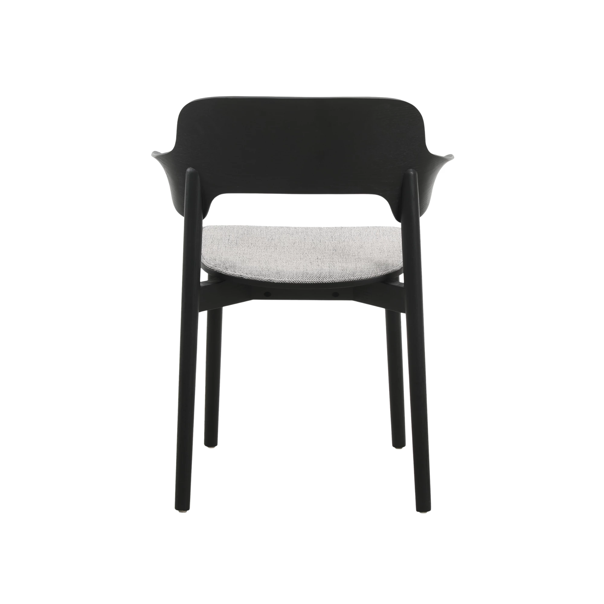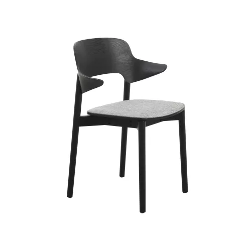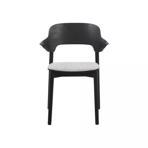 Moderner Eichenholzstuhl mit Armlehnen und gepolsterter Sitzfläche. Aus Massivholz gefertigt – ideal für elegante HoReCa-Bereiche. In mehreren Holz- und Stoffvarianten erhältlich.