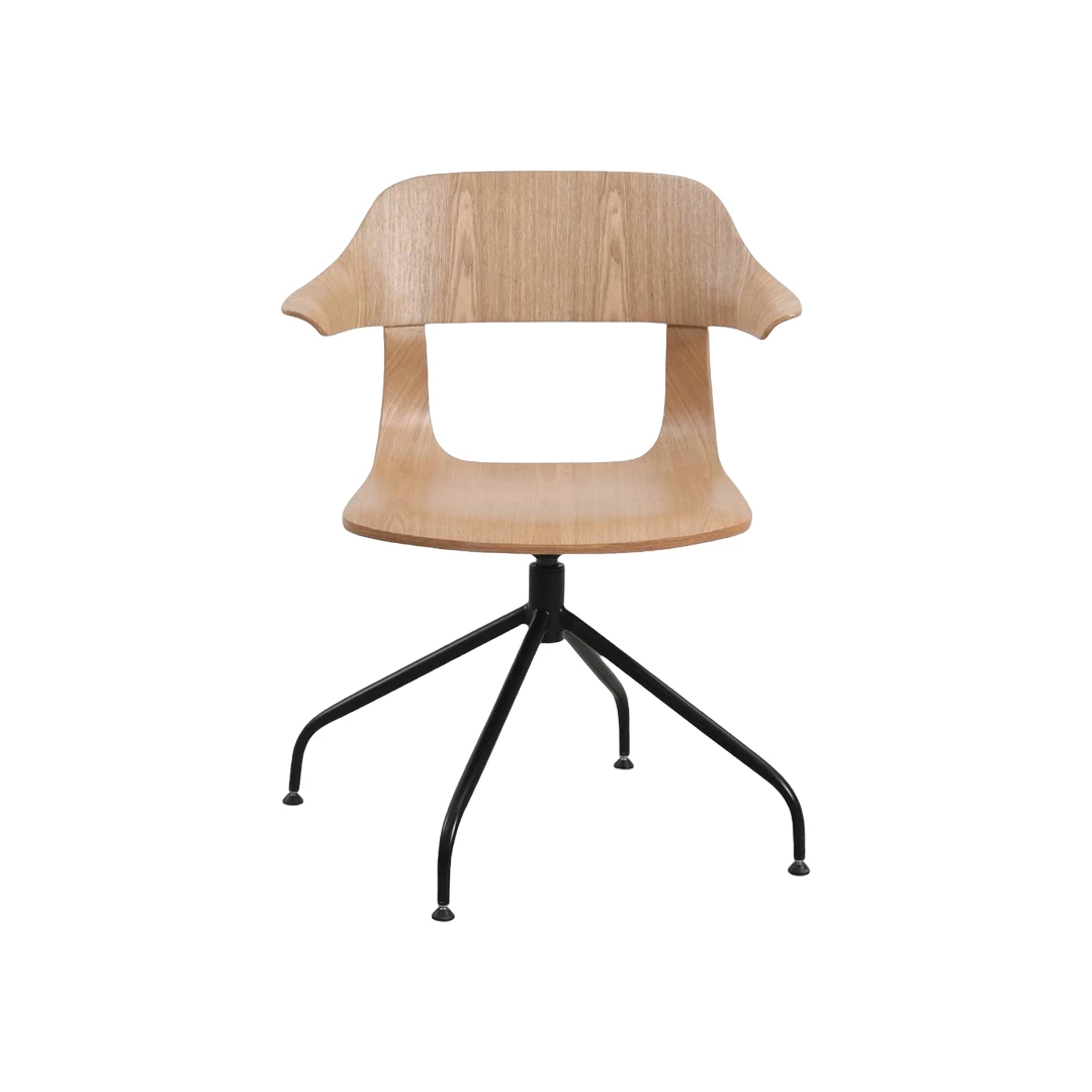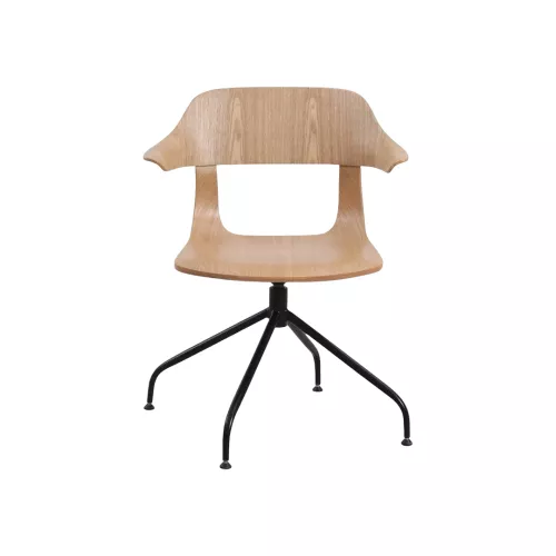 Stilvoller Stuhl mit geschwungener Holzschale und integrierten Armlehnen. Das offene Rückendesign sitzt auf einem schwarzen Spider-Metallgestell – eine harmonische Verbindung von Ästhetik und Stabilität. Ideal für moderne HoReCa-Umgebungen.