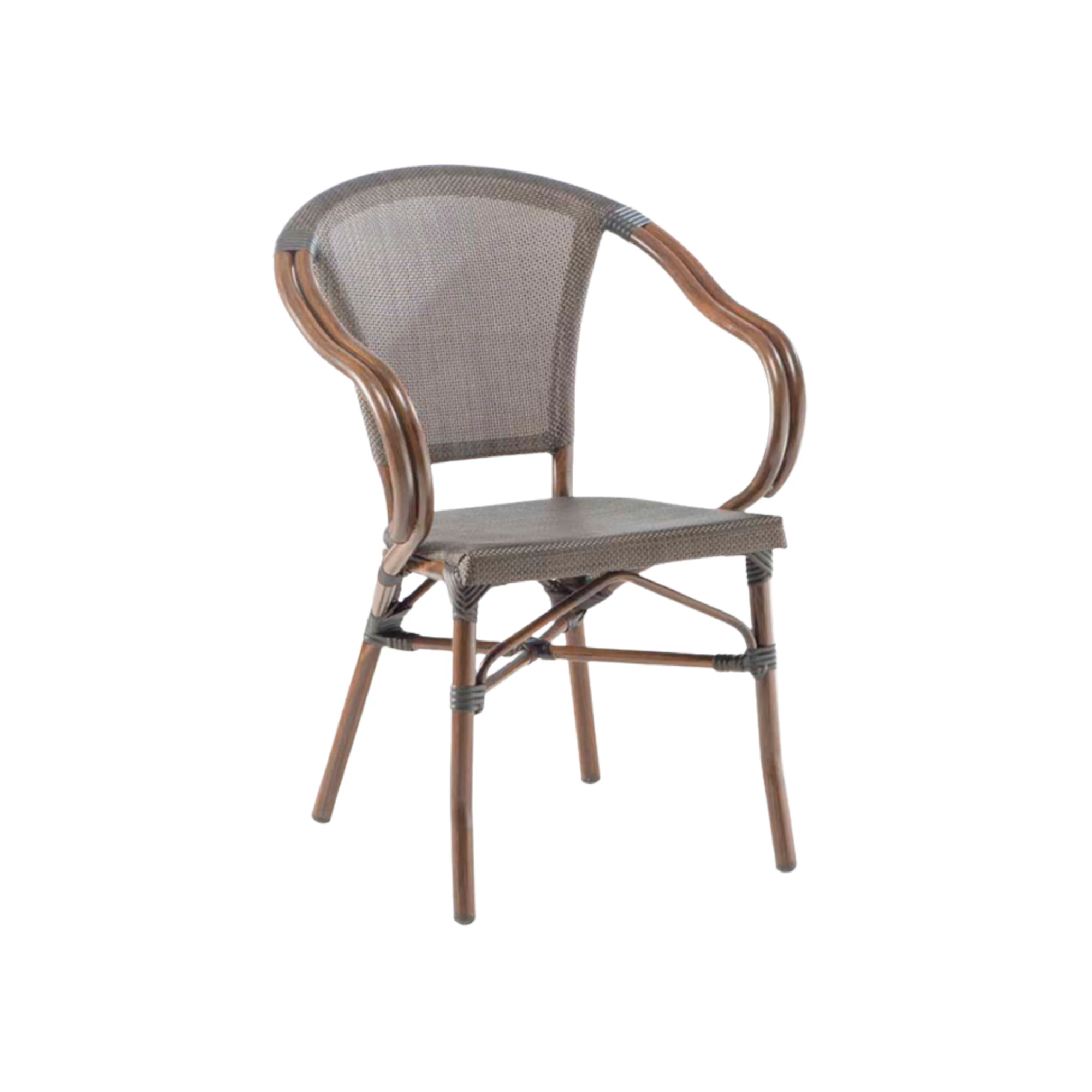 Bertha A ist ein stapelbarer Outdoor-Stuhl mit Armlehnen – ideal für Gastronomieterrassen. Der Aluminiumrahmen in Holzoptik verleiht ihm ein natürliches Aussehen. Sitz und Rücken bestehen aus strapazierfähigem Textilen. Stilvoll und wetterfest, passt er zu vielen Einrichtungsstilen.
