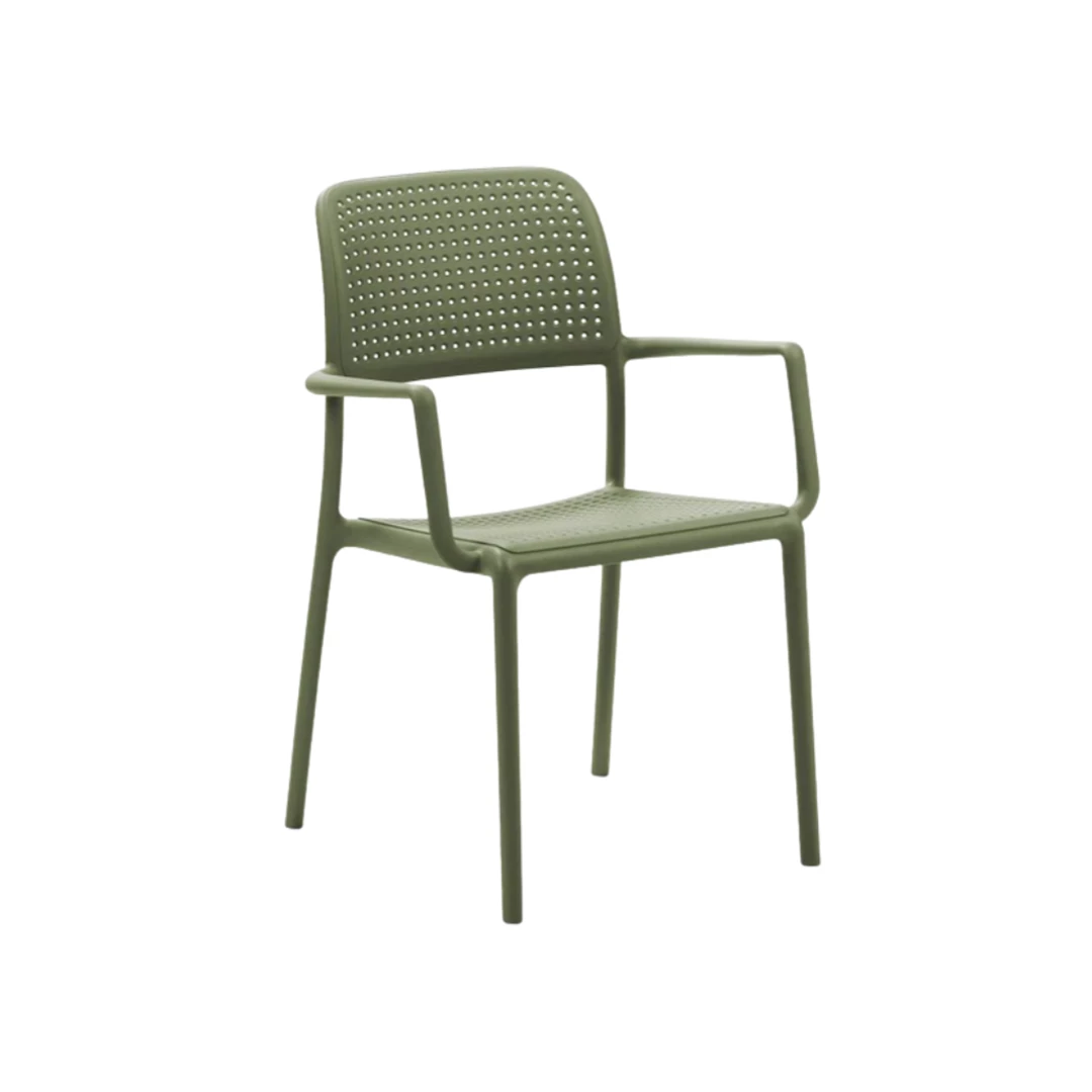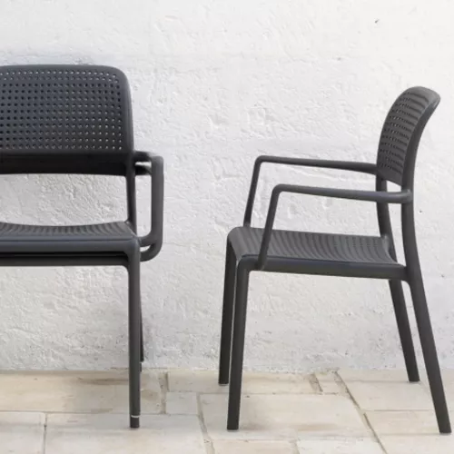 Bora ist ein langlebiger, leichter Outdoor-Stuhl aus recycelbarem Polypropylen mit UV-Zusätzen. Die Monoblock-Struktur mit Armlehnen sorgt für Stabilität und Komfort. Er ist stapelbar und in mehreren Farben erhältlich – perfekt für Gastronomieterrassen. Eine praktische Kombination aus Design, Funktionalität und Widerstandsfähigkeit.