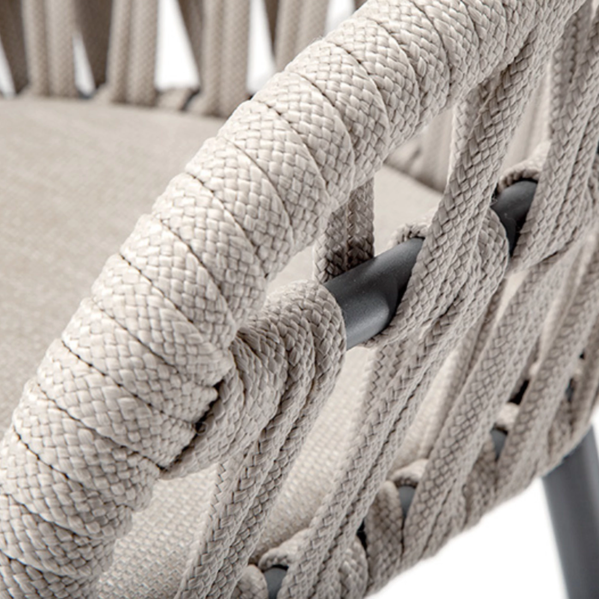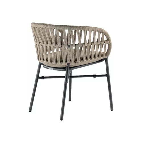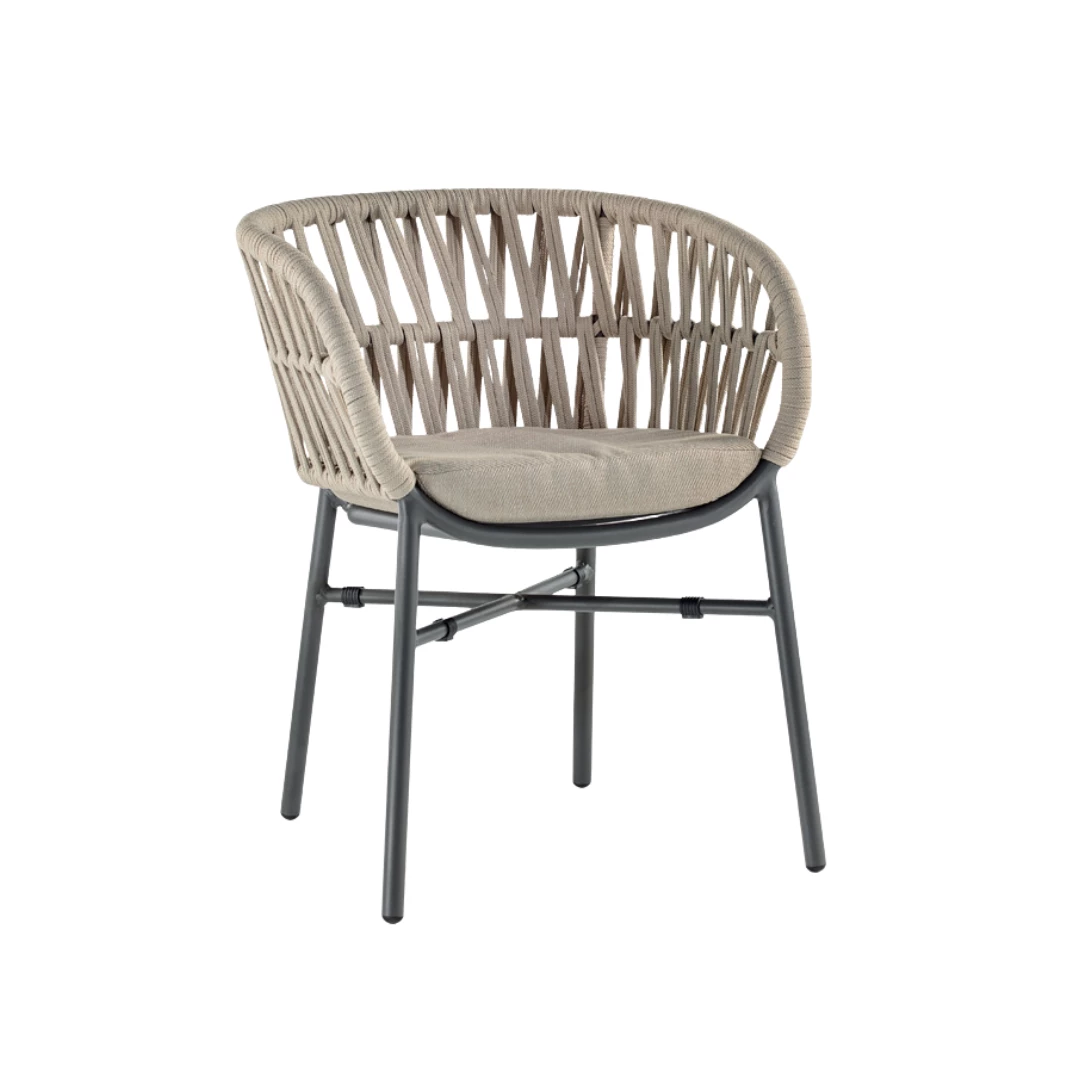 Der Breeze Outdoor-Stuhl kombiniert Komfort mit moderner Eleganz für jede HORECA-Terrasse. Er hat einen leichten Aluminiumrahmen, eine Rückenlehne und Armlehnen aus Polyolefin-Seil sowie ein bequemes Textylene-Kissen. Erhältlich in mehreren Farbvarianten.
