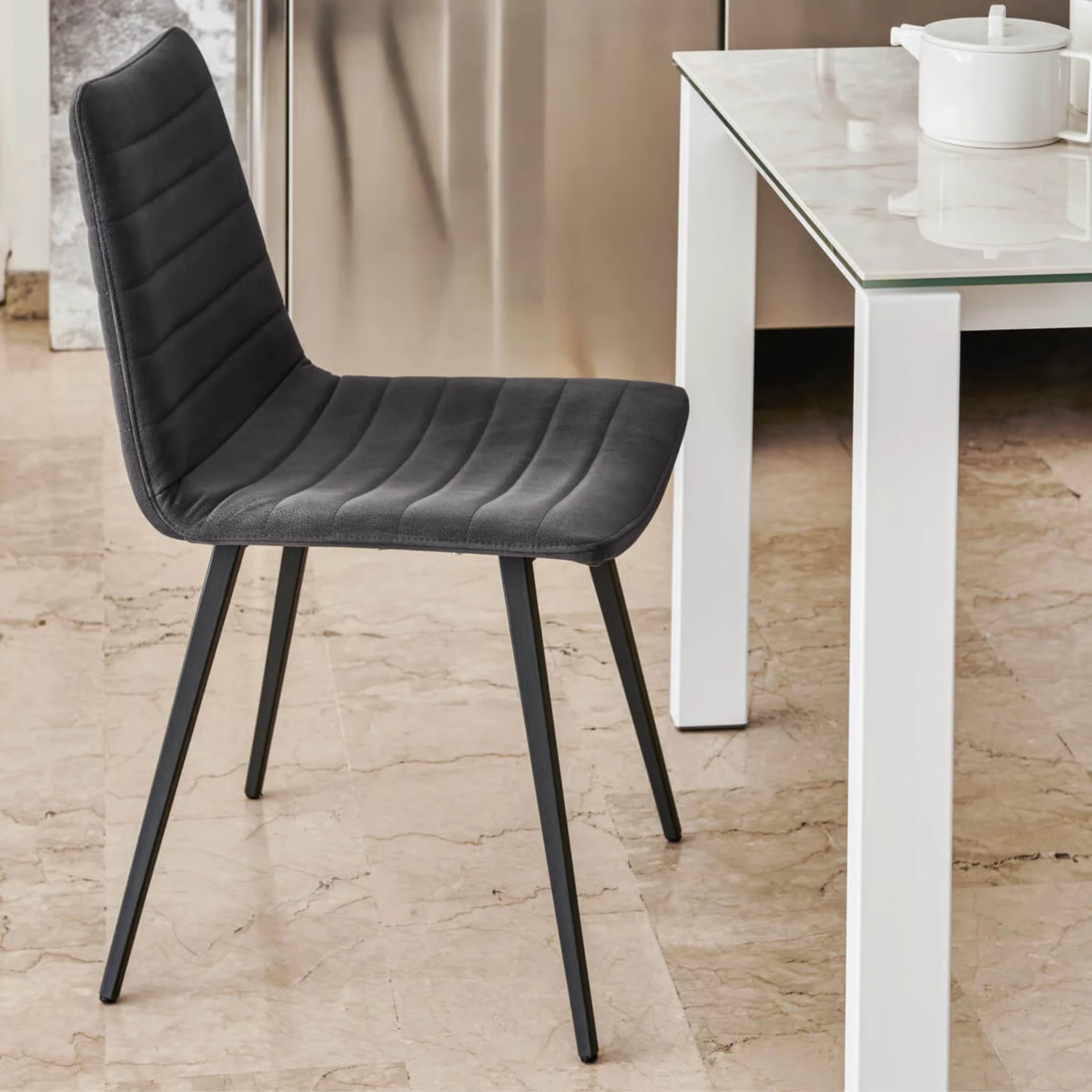 Cover S M Q TS ist ein moderner gepolsterter Stuhl für den HORECA-Bereich. Das stabile Vierfußgestell aus lackiertem Stahl ist in mehreren Farben erhältlich. Der Bezug ist wählbar aus professionellen Stoffen oder Kunstleder. Ideal für Restaurants, Cafés und stark frequentierte Gastronomiebereiche.