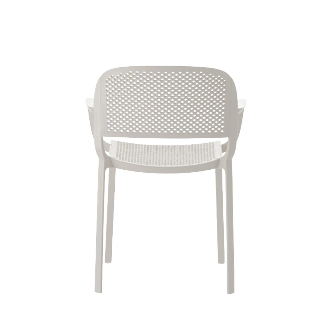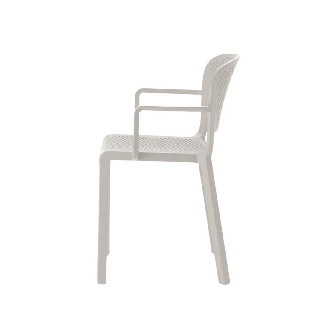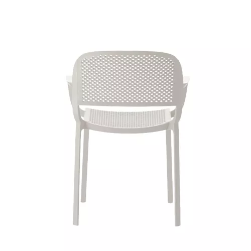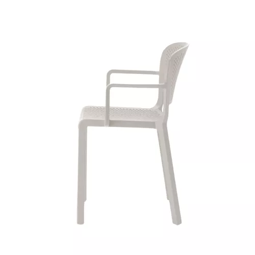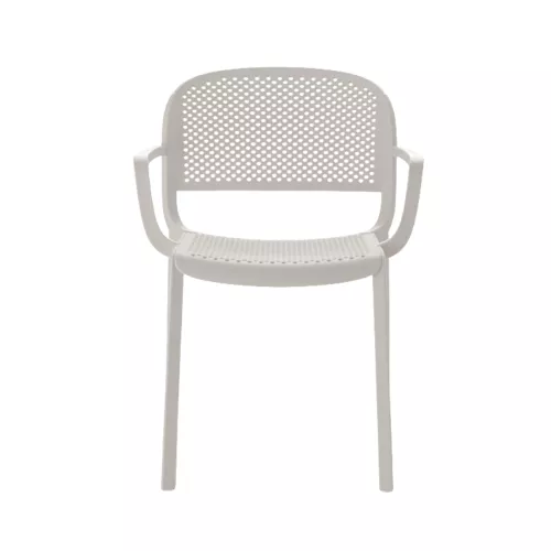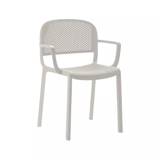 Dome 266 ist ein Outdoor-Stuhl mit Armlehnen aus robustem Polypropylen. Die perforierte Sitzfläche und Rückenlehne bieten Komfort und Belüftung. UV-beständig, antistatisch und stapelbar – perfekt für Gastronomieterrassen.