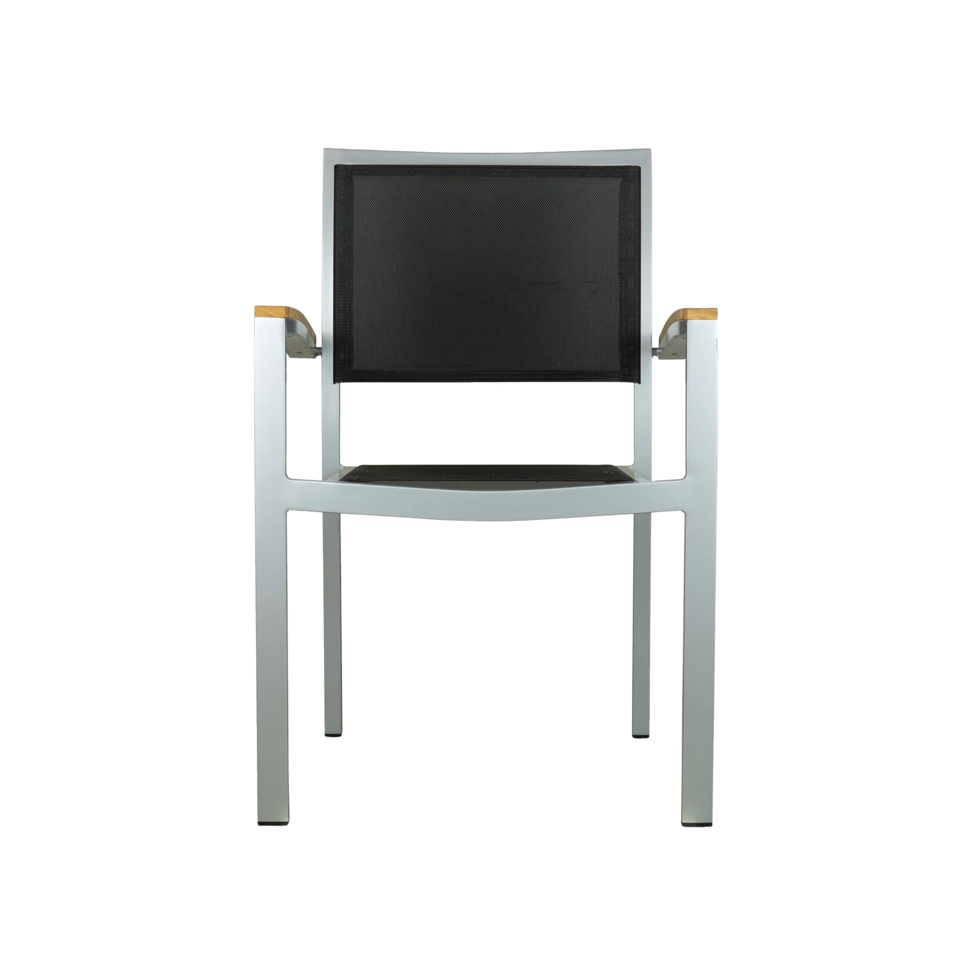 Der George Silver / Black Textilene Stuhl vereint Haltbarkeit und Stil und eignet sich hervorragend für Terrassenrestaurants, Cafés und Bistros. Mit einem robusten Aluminiumrahmen von 22221,8mm, pulverbeschichtet für zusätzliche Haltbarkeit und UV-Beständigkeit, ist er die ideale Wahl für den Außenbereich. Der Textilene Stoff sorgt für hohen Komfort, ist atmungsaktiv und trocknet schnell, um den Gästen maximalen Komfort zu bieten. Die integrierten Armlehnen tragen zur Entspannung und Bequemlichkeit bei. Der Stuhl ist stapelbar und 24 Stühle können pro Einheit gestapelt werden, was ihn ideal für die platzsparende Lagerung in weniger frequentierten Zeiten macht. Ob für die Gestaltung eines modernen Außenbereichs oder die Aufwertung eines bestehenden Raumes – der George Silver / Black Textilene Stuhl kombiniert Funktionalität, Komfort und zeitloses Design.