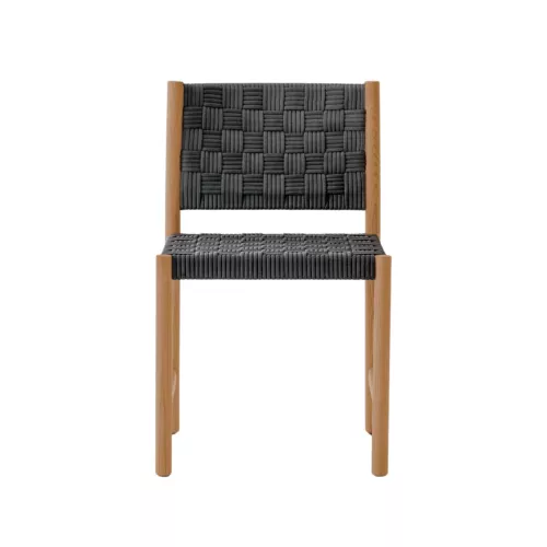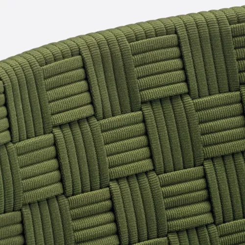 Griante interpretiert das Konzept von geflochtenen Sitzmöbeln neu und vereint traditionelle Handwerkskunst mit moderner industrieller Präzision. Die zylindrischen Beine sind filigran gedrechselt, während der Aluminiumrahmen für einen stabilen Sitz sorgt. Das Besondere an Griante ist die handgeflochtene Sitzfläche und Rückenlehne, die in Italien aus vollständig recycelbaren Polypropylen-Garnbändern mit einer raffinierten, dreidimensionalen Textur gefertigt werden. Das Flechtmuster, definiert durch die geometrische Wiederholung quadratischer Formen, betont die großzügigen Proportionen des Sitzes und unterstreicht seine elegante, einladende Ästhetik. Das Ergebnis ist ein Stuhl, der Raffinesse, Komfort und zeitloses Design verkörpert und gleichzeitig leicht zu demontieren und umweltfreundlich ist.