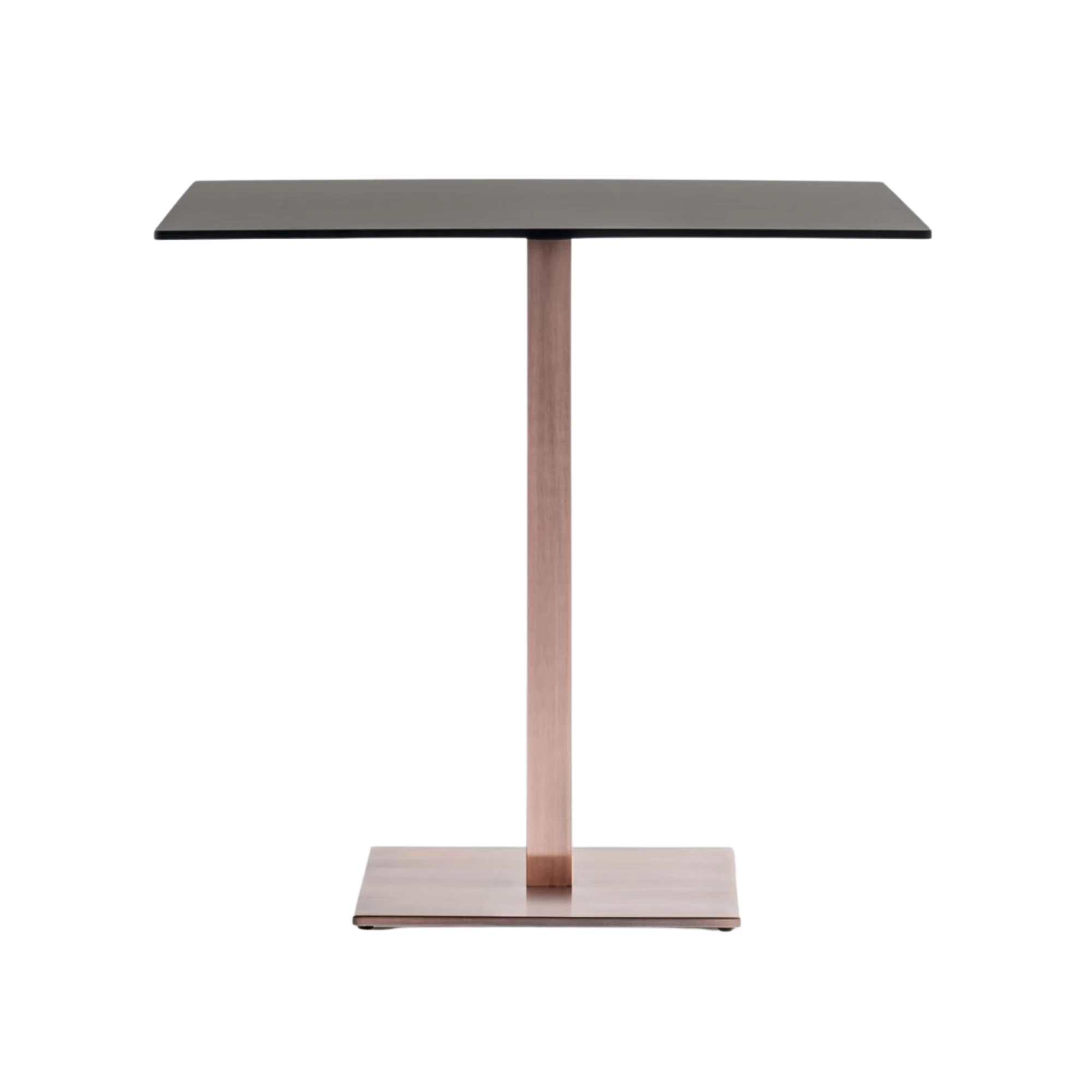 Tischgestell mit sandgestrahlter Gusseisenbasis, optionaler Abdeckplatte aus Edelstahl und einer Mittelsäule aus Stahl oder Edelstahl. Ein funktionales, vielseitiges Design – ideal für viele Tischplatten.