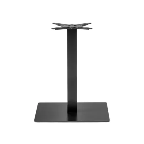 Tisch mit quadratischer, sandgestrahlter Gusseisenbasis, wahlweise mit pulverbeschichteter Stahlsäule oder Edelstahlsäule und passender Abdeckung. Die Tischplatte ist in verschiedenen Größen und Ausführungen erhältlich.