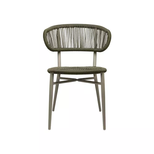 The seat and backrest are crafted from woven rattan, supported by a lightweight aluminum frame finished with an anthracite powder coating. The result is a balanced combination of warmth and durability, ideal for intensive terrace use. Its low weight makes daily handling effortless, while the stackable design ensures practical storage without compromising style.