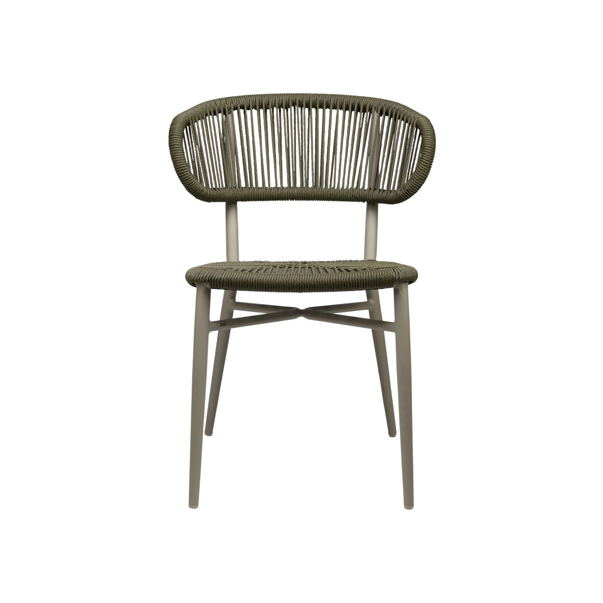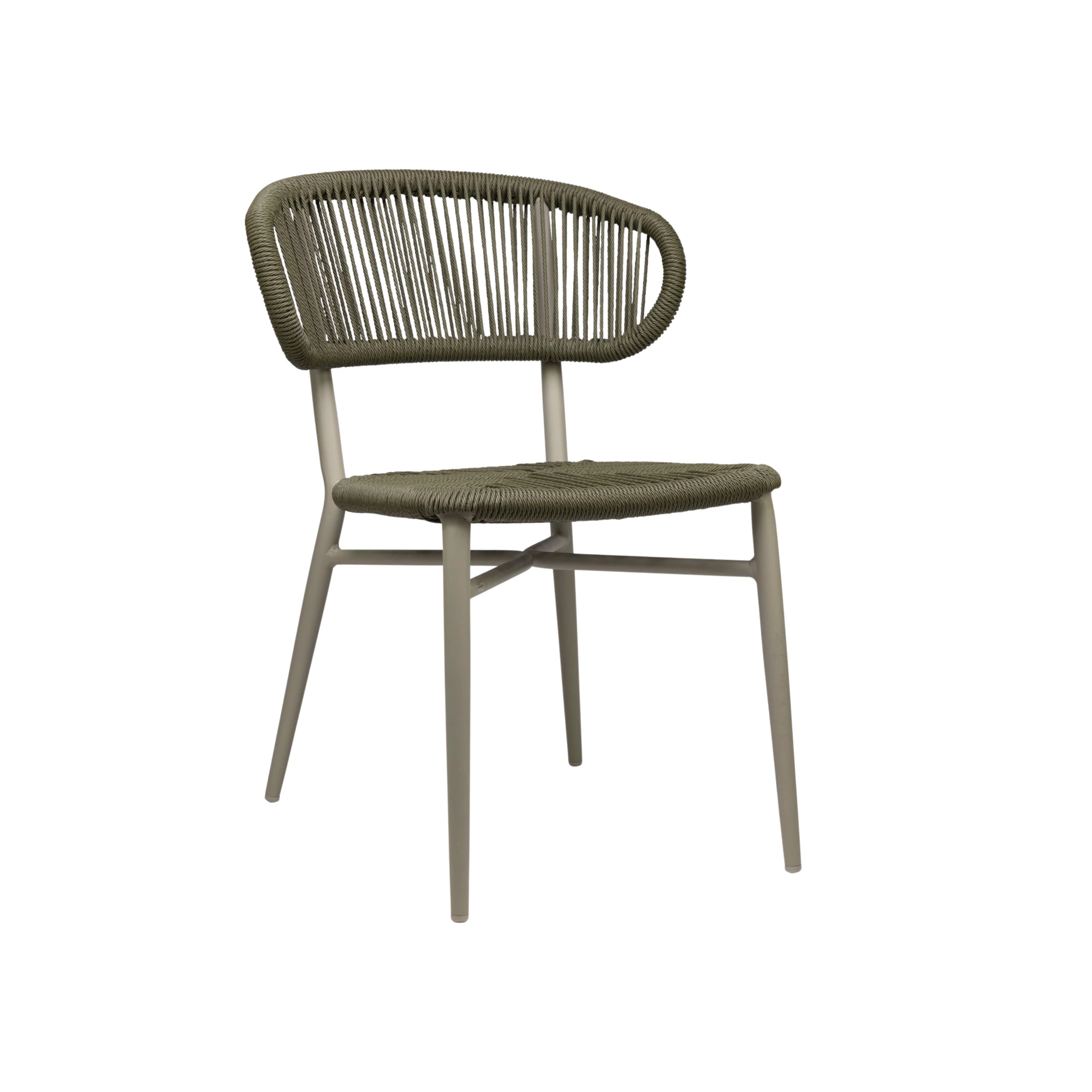 Sitz und Rückenlehne bestehen aus geflochtenem Rattan und werden von einem leichten Aluminiumrahmen mit anthrazitfarbener Pulverbeschichtung getragen. Die Konstruktion ist robust und gleichzeitig leicht zu handhaben. Dank der Stapelbarkeit eignet sich der Stuhl ideal für effiziente Lagerung und flexible Terrassengestaltung.