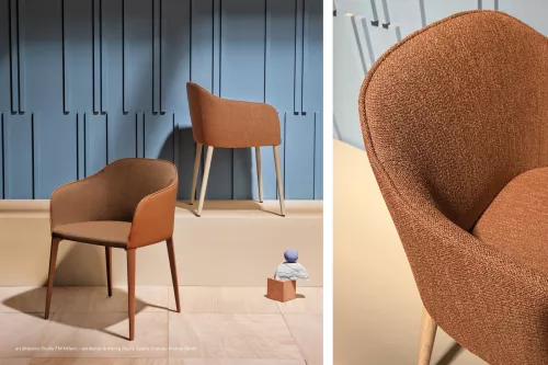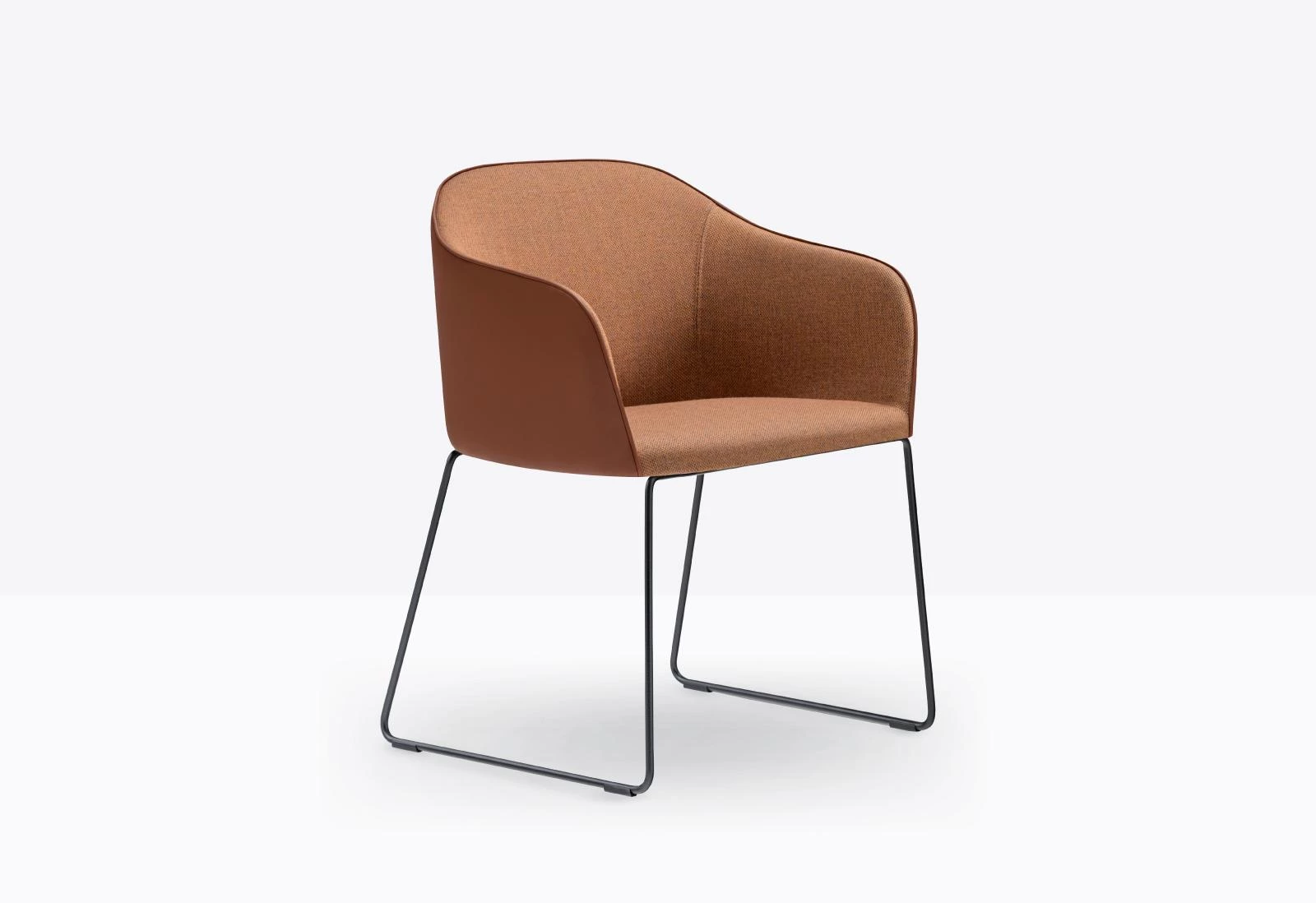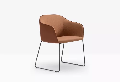 Stilistische Schlichtheit kennzeichnet die Kollektion Laja 2, die sich durch weiche und gemütliche Formen auszeichnet. Der Sessel zeichnet sich durch einen Sitz aus eingespritztem Polyurethanschaum mit elastischen Gurten, eine flexible, einladende Rückenlehne und Schlittenbeine aus Stahlrohr aus. Die große Auswahl an Farben und Stoffen ermöglicht ein- oder zweifarbige Bezugskombinationen für die Innen- und Außenschale.