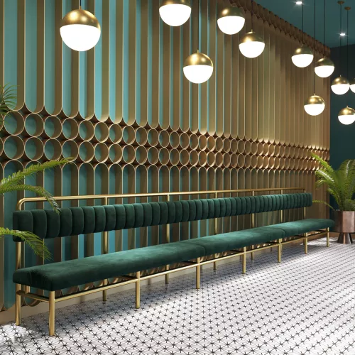 Manhattan Bench ist eine modulare Essbank mit pulverbeschichtetem Stahlrahmen und hochdichtem Schaumstoff für besten Komfort und Haltbarkeit. Die Bank kann vollständig nach Kundenspezifikation gefertigt und mit einer Vielzahl professioneller Stoffe bezogen werden.