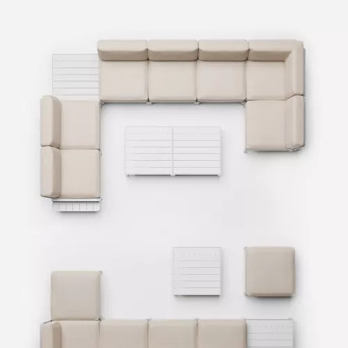 Der Maximo Elemento Angolo ist das Eckelement eines modularen Outdoor-Loungesystems. Sein UV-beständiger Rahmen aus recyceltem Glasfaser-Polypropylen erlaubt eine werkzeuglose Befestigung von Rücken- und Armlehnen an jeder Seite. Die gepolsterten Kissen sind abnehmbar und mit Reißverschluss versehen – optimal für flexible Horeca-Lösungen im Außenbereich.