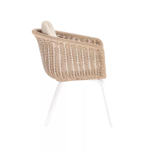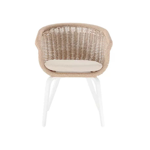Der Outdoor-Sessel Mellara vereint Langlebigkeit und stilvolles Design. Der Aluminiumrahmen ist mit witterungsbeständigem Wintech-Seil umwickelt. Abnehmbare Kissen mit Olefin-Stoff und schnelltrocknendem Schaum machen ihn ideal für Horeca-Terrassen.
