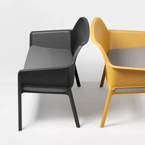 Die Net Bench ist eine stilvolle und praktische Sitzlösung, entwickelt für höchste Ansprüche im gewerblichen Außenbereich. Hergestellt aus Monobloc-Glasfaser-Polypropylen mit UV-Zusätzen und matter Oberfläche, bietet sie hervorragende Haltbarkeit, Witterungsbeständigkeit und Farbstabilität. Mit rutschfesten Füßen und stapelbarem Design für einfache Lagerung. Erhältlich in sechs Rahmenfarben—Weiß, Anthrazit, Salice, Tortora, Senape, Coral—kombinierbar mit einem Sitzkissen aus Polyurethanschaum (Dichte 28 kg/m³) in Grey Stone, Rosa Quarzo, Senape, Denim, The Verde, Sardinia, Weiß oder Grau. Vollständig recycelbar und perfekt für Restaurantterrassen, Cafés und Bistros, die Komfort, Stil und Langlebigkeit verlangen.