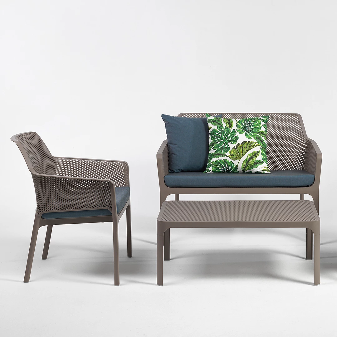 Der Net Table ist ein moderner und langlebiger Beistelltisch, ideal für professionelle Außenbereiche. Hergestellt aus Monoblock-Glasfaser-Polypropylen mit UV-Zusätzen und einer edlen matten Oberfläche sorgt er für langanhaltende Farbstabilität und Wetterbeständigkeit. Rutschfeste Füße sorgen für Sicherheit und ein recycelbares Gestell für Nachhaltigkeit. Erhältlich in sechs eleganten Farben – Weiß, Anthrazit, Salice, Tortora, Senape und Koralle – eignet sich dieser Polypropylen-Tisch perfekt für Terrassenrestaurants, Cafés und Bistros und vereint Stil, Funktionalität und professionelle Haltbarkeit.