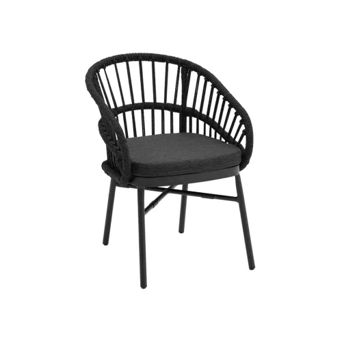 Nikita ist ein stilvoller Outdoor-Stuhl, ideal für jede HORECA-Terrasse. Das pulverbeschichtete Gestell ist wetterbeständig, während die geflochtene Seilbespannung Eleganz verleiht. Robust und ästhetisch – perfekt für den Außenbereich.