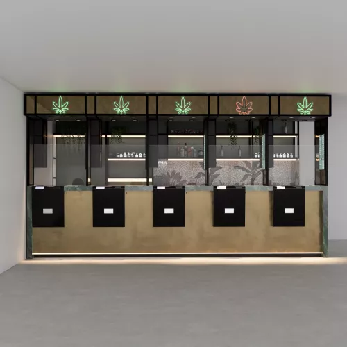 Ein markantes, modernes Barkonzept, geprägt von starken Kontrasten, edlen Materialien und einem Hauch von dezentem Luxus. Die Servierplatte und die Seitenwände sind aus Marmor in der Farbe Rainforest Green gefertigt und bieten eine eindrucksvolle, natürliche Textur mit warmen, erdigen Maserungen, die sofort zum optischen Mittelpunkt des Designs wird.