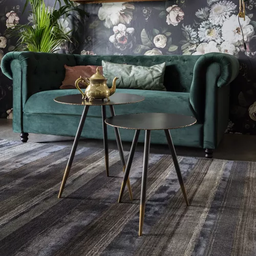 Das Ostrom Set besteht aus zwei Beistelltischen, die industriellen Charme mit Eleganz verbinden. Die 3 mm starken Tischplatten aus pulverbeschichtetem Gunmetal-Eisen mit goldfarben geschweißten Kanten schaffen Kontraste. Beine mit goldenen Füßen runden das Design ab. Maße: S – Ø40×44 cm, M – Ø45×50 cm. Ideal für stilvolle Horeca-Umgebungen.