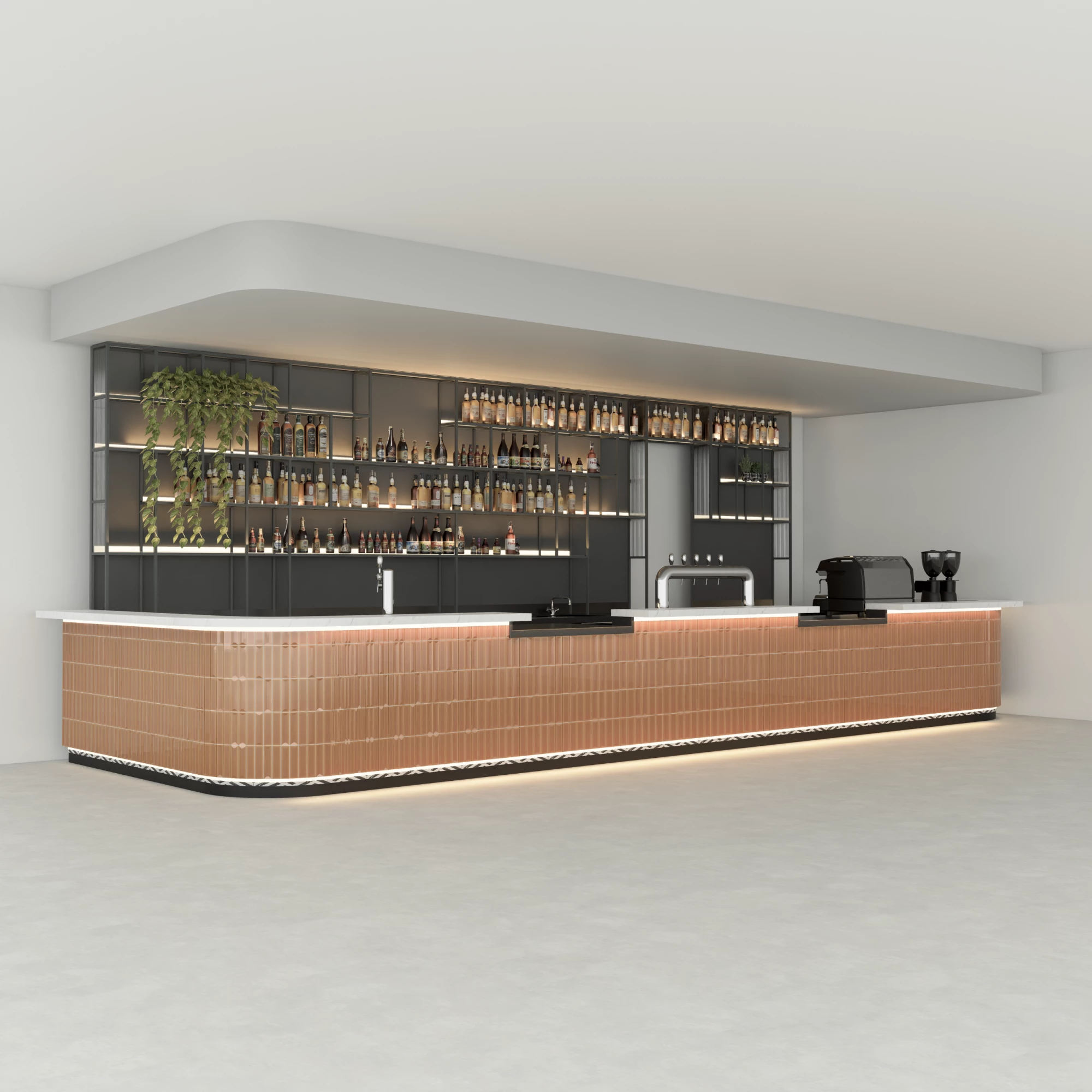 Die Barfront ist mit glänzenden, glasierten Porzellanfliesen in Kamelfarbe verkleidet, die vertikal angeordnet sind und so Rhythmus, Höhe und eine subtile architektonische Harmonie erzeugen. Ihre frostbeständige Oberfläche verleiht ihr Langlebigkeit und Eleganz, während das glänzende Material mit dem einfallenden Licht wunderschön harmoniert.