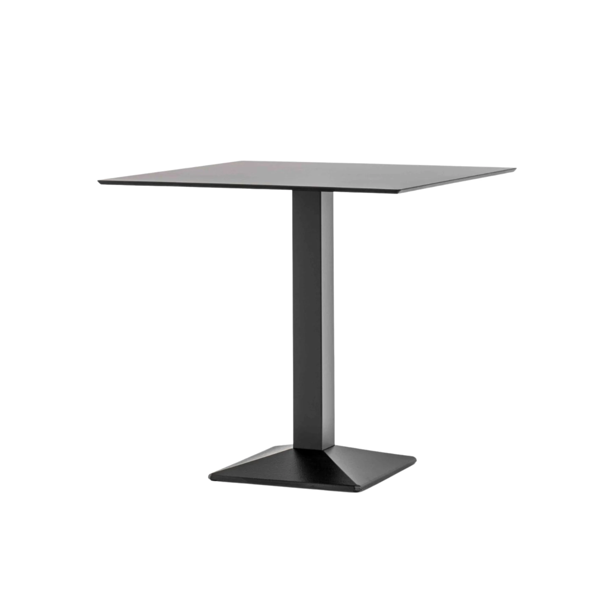 Tisch mit einer pyramidenförmigen Basis aus sandgestrahltem, pulverbeschichtetem Gusseisen und einer Säule aus Stahlrohr. Erhältlich mit quadratischen Tischplatten in verschiedenen Größen und Ausführungen.