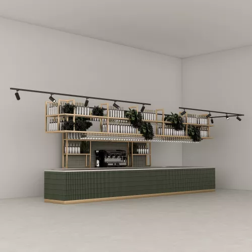 Über der Theke setzen der Hänge- und der Rückwandrahmen – gefertigt aus 4 x 4 cm großem, pulverbeschichtetem Metall in Goldoptik – einen luxuriösen Akzent. Ihre geometrische Schlichtheit verleiht dem Raum Eleganz und rahmt die Ausstellungsfläche dezent ein.
