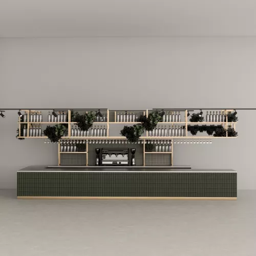Die Vorderseite ist mit glänzend grünen, glasierten Porzellanfliesen in elegantem Kitkat- Design gestaltet, die durch eine zementfarbene Fuge ergänzt werden. Diese betont die vertikale Rhythmik und verleiht der Bar eine klare architektonische Struktur. Darunter sorgt ein Sockel aus gebürstetem Messing-HPL für Wärme und einen dezenten Schimmer, hebt das Design optisch an und verleiht der Bar eine elegante, schwebende Präsenz.