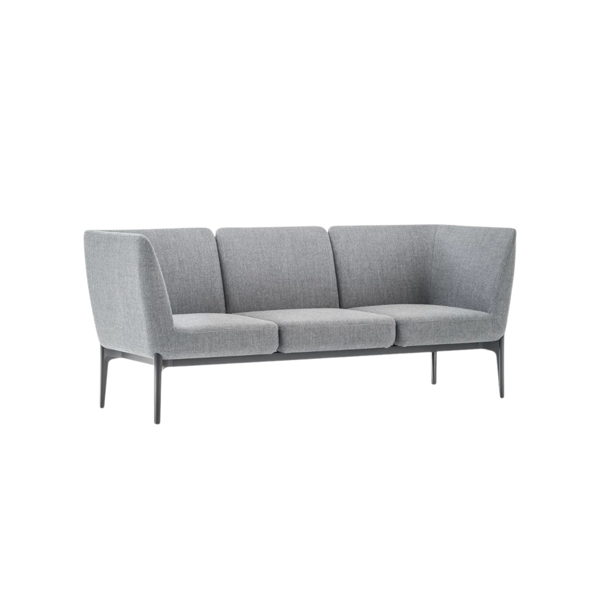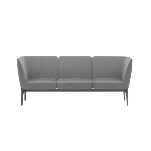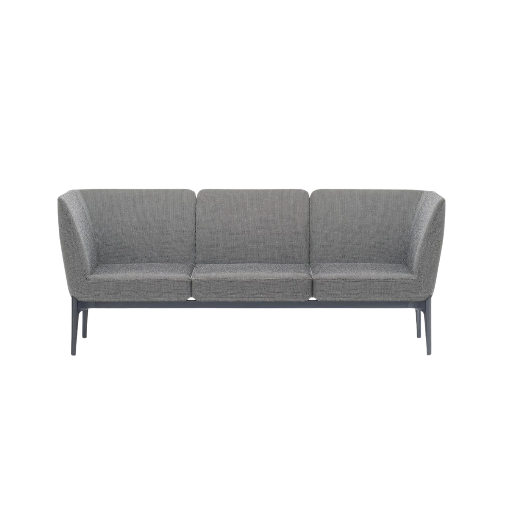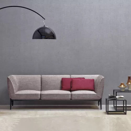 Social ist ein modulares System aus linearen, Eck- und gebogenen Sitzelementen sowie Poufs, die sich beliebig kombinieren lassen und so ein unendlich vielfältiges Sofa für gesellige Stunden schaffen. Das System besteht aus zwei, drei oder vier linearen und Eck-Sitzern mit Polyurethanschaumpolsterung, elastischen Gurten in der Rückenlehne, einem Stahlrahmen und Beinen aus Aluminiumdruckguss an den Enden.