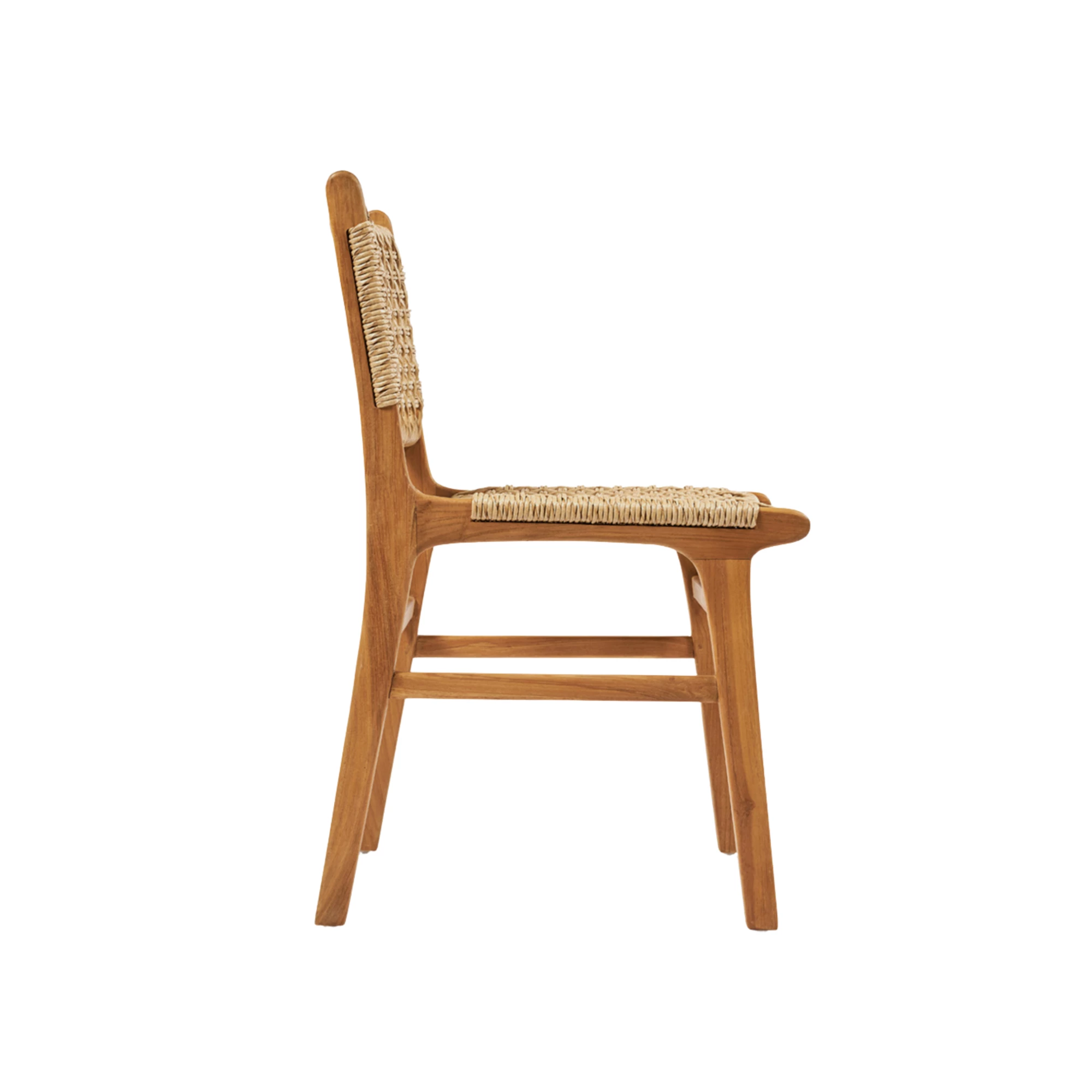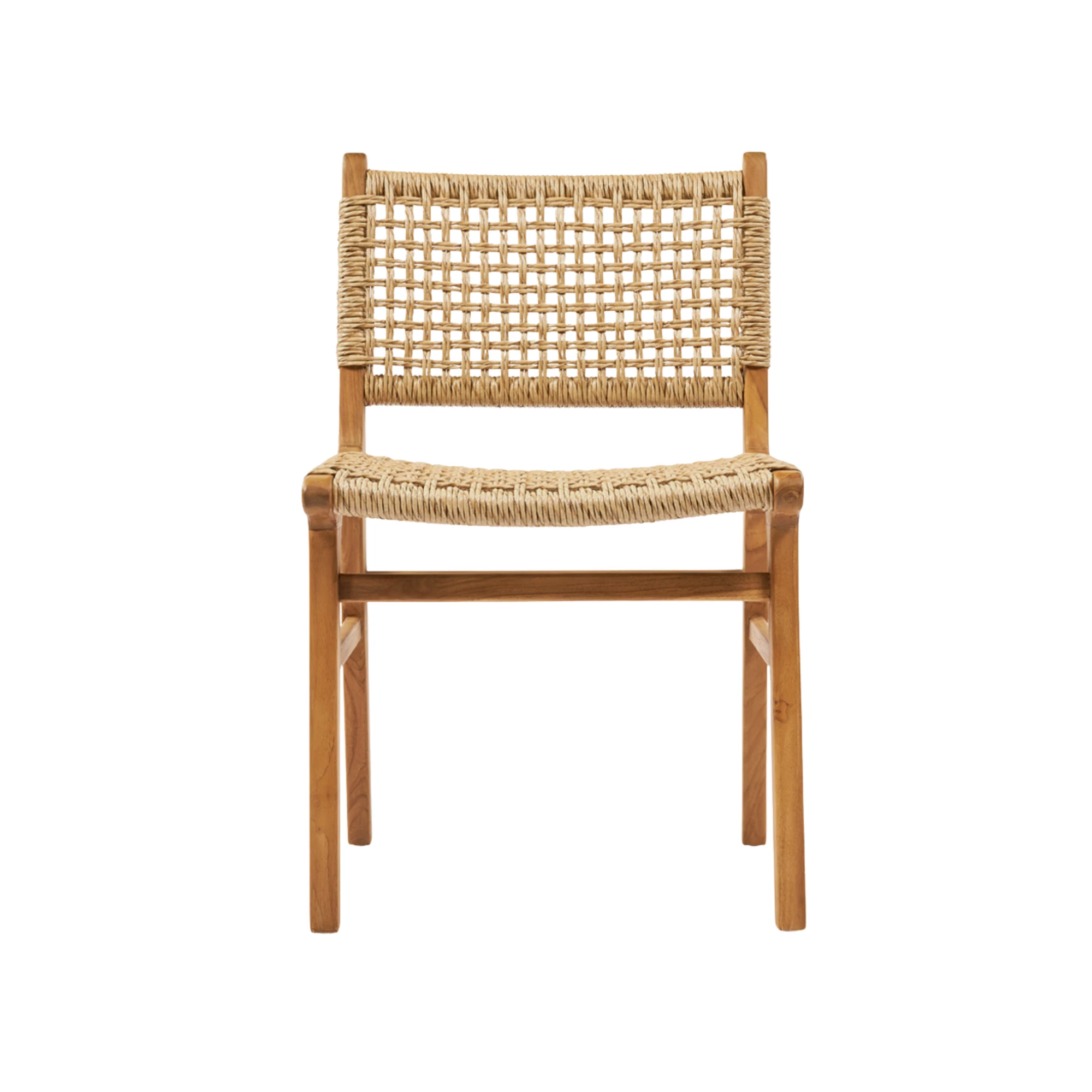Stuhl aus Teakholz mit Sitz und Rückenlehne aus geflochtenem synthetischem Rattan. Die Kombination aus massivem Holz und strapazierfähigem Geflecht sorgt für eine natürliche Optik und eignet sich ideal für den Einsatz in Gastronomie- und Objektbereichen, sowohl im Innen- als auch im Außenbereich.