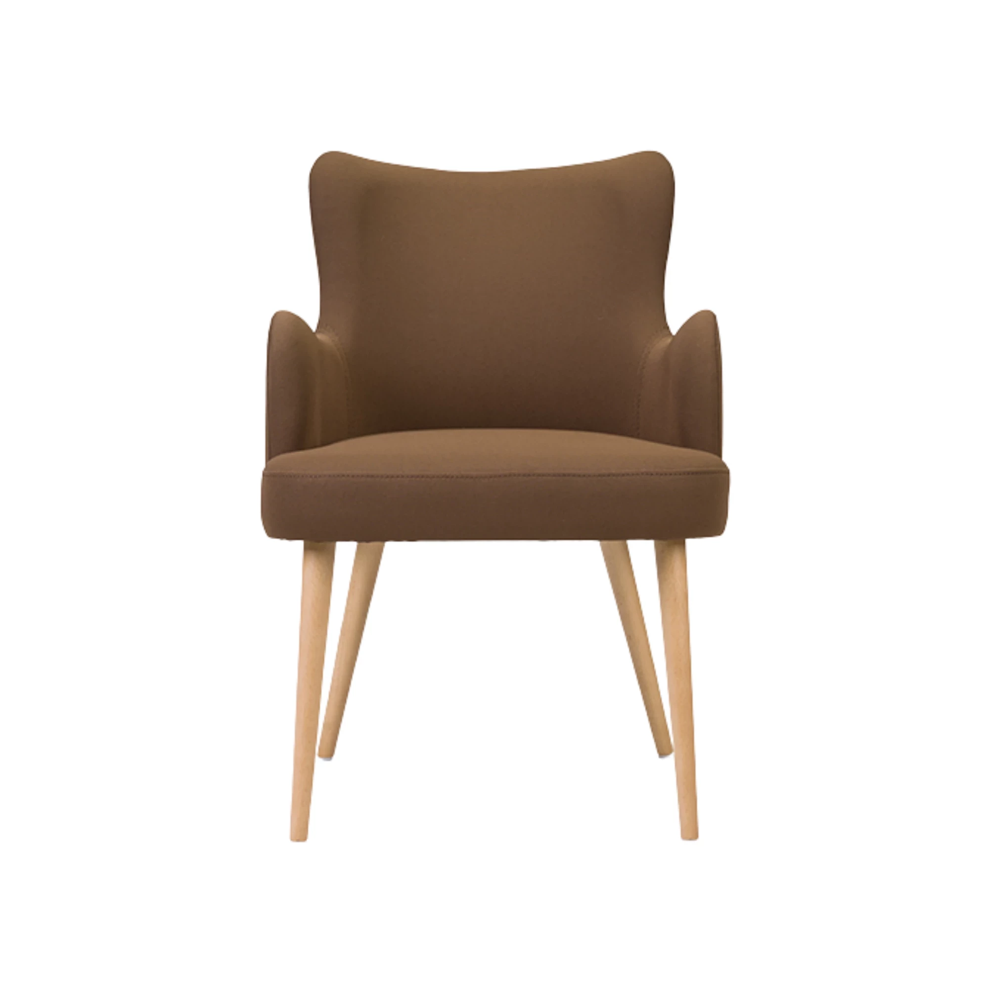 Tavro ist ein Holzstuhl mit Armlehnen im eleganten Mid-Century-Stil. Der Rahmen besteht aus massiver Buche in verschiedenen Beizfarben. Sitz und Rücken sind mit professionellen Stoffen oder Kunstleder gepolstert – perfekt für HORECA-Einsätze.