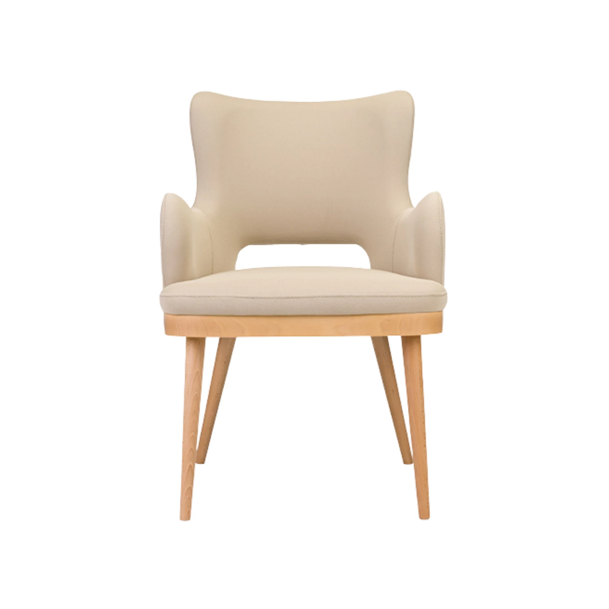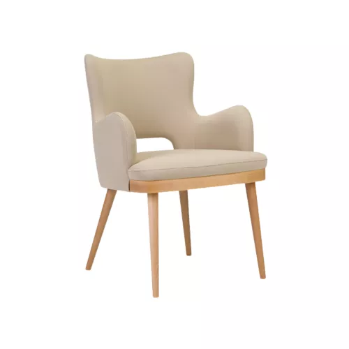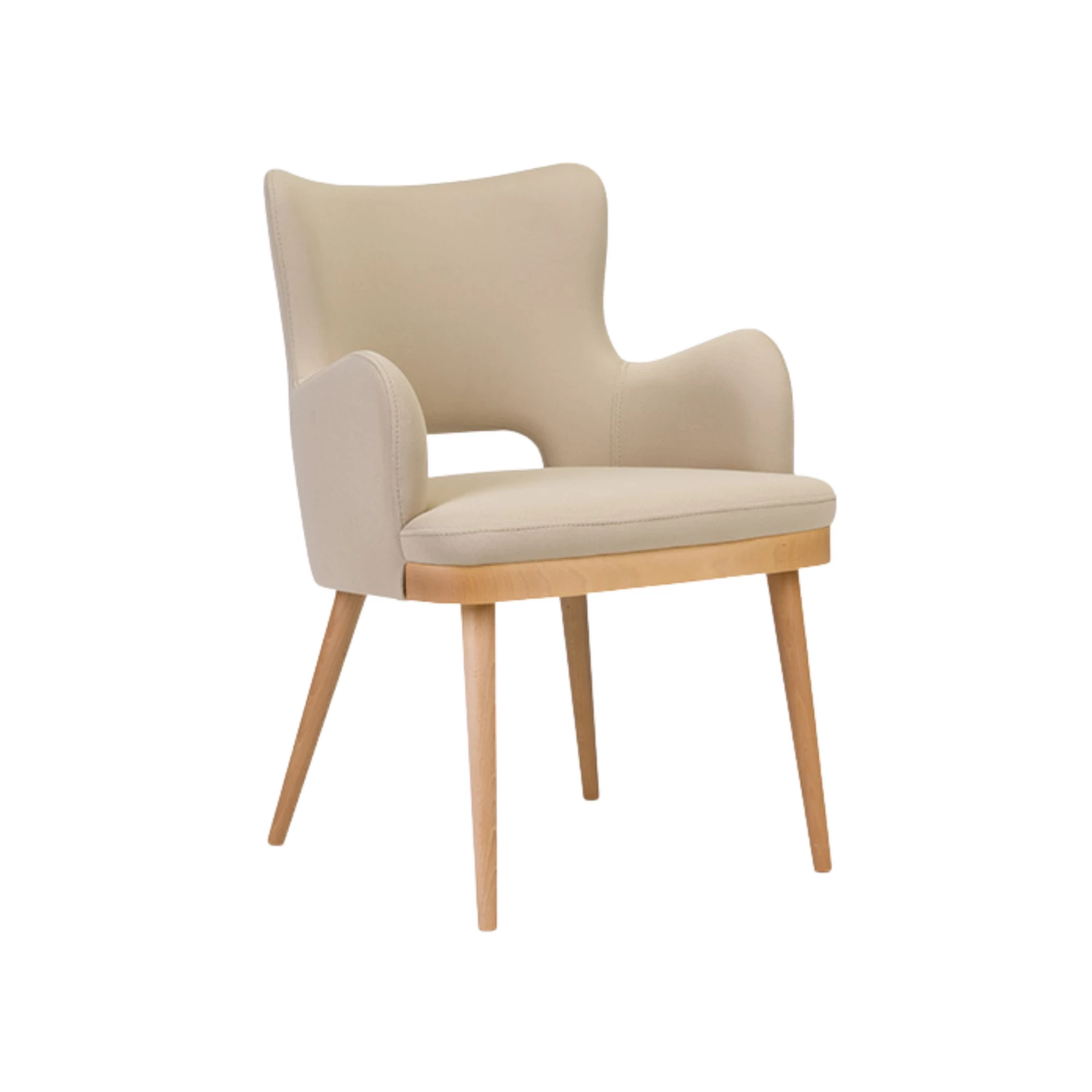 Tavro Hole ist ein Holzstuhl mit Armlehnen und charakteristischem Rückenausschnitt. Das Buchenholzgestell ist in mehreren Beiztönen erhältlich, kombiniert mit einer voll gepolsterten Sitzfläche und Rückenlehne. Perfekt für den HORECA-Bereich mit Mid-Century-Flair.