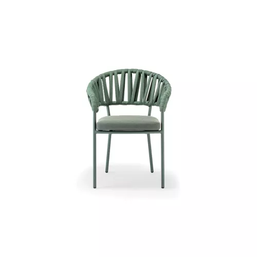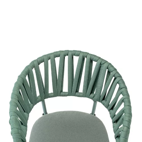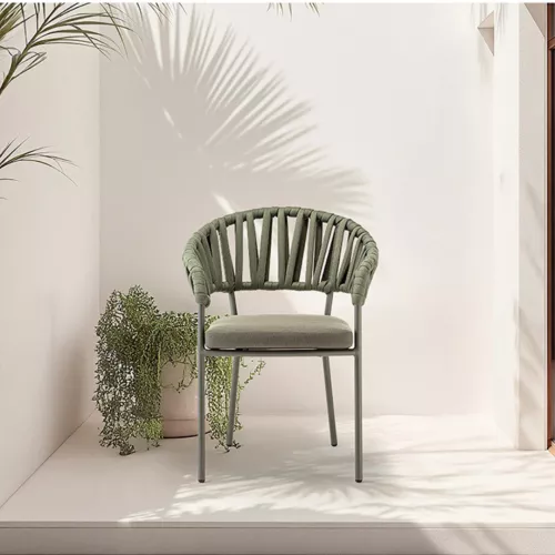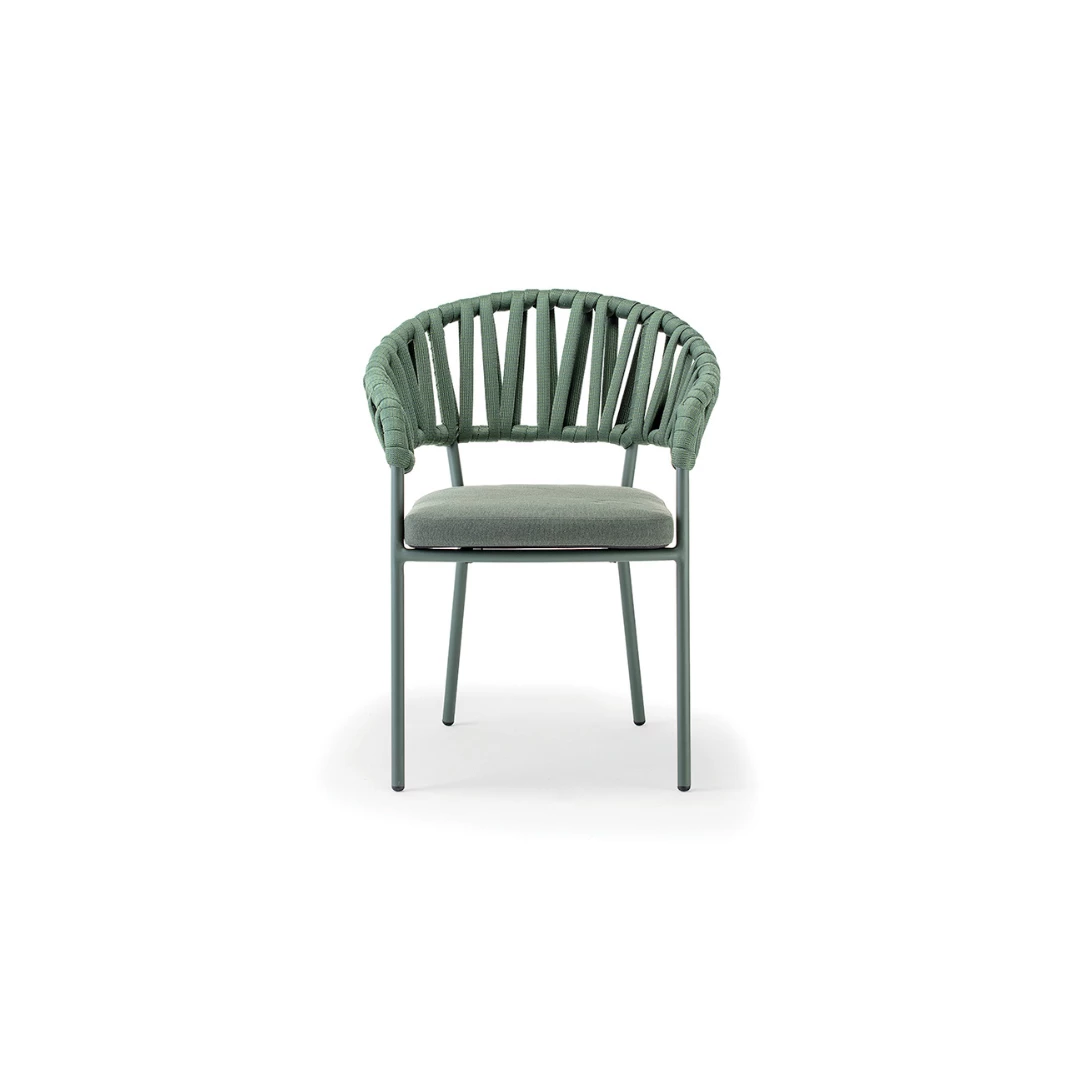 Victory ist ein stapelbarer Outdoor-Armlehnstuhl mit Aluminiumrahmen, ummantelt mit robuster Acrylkordel. Das Sitzkissen ist mit wasserabweisendem Olefin-Stoff bezogen. Ideal für jede HORECA-Terrasse – stilvoll, bequem und langlebig.