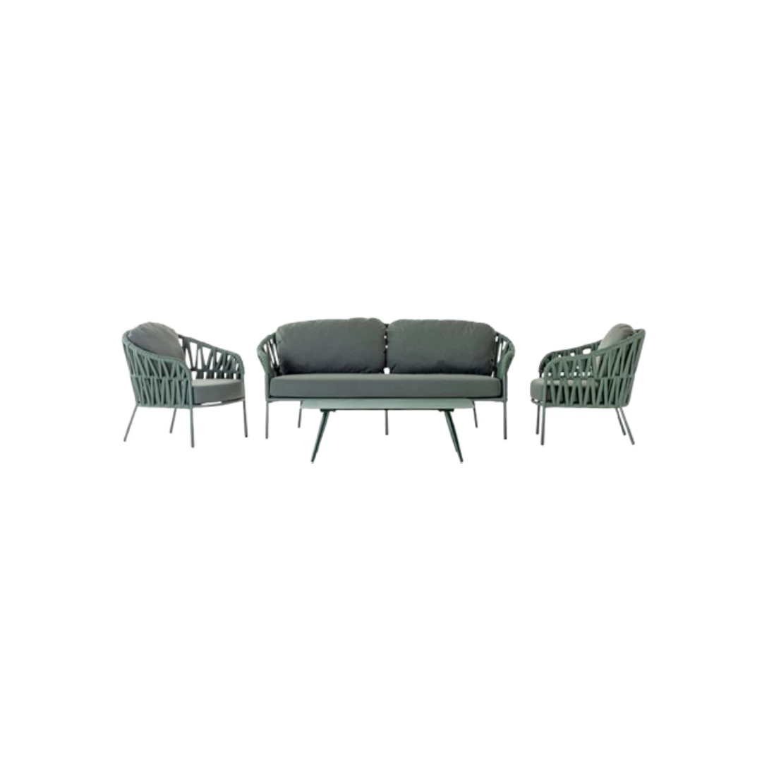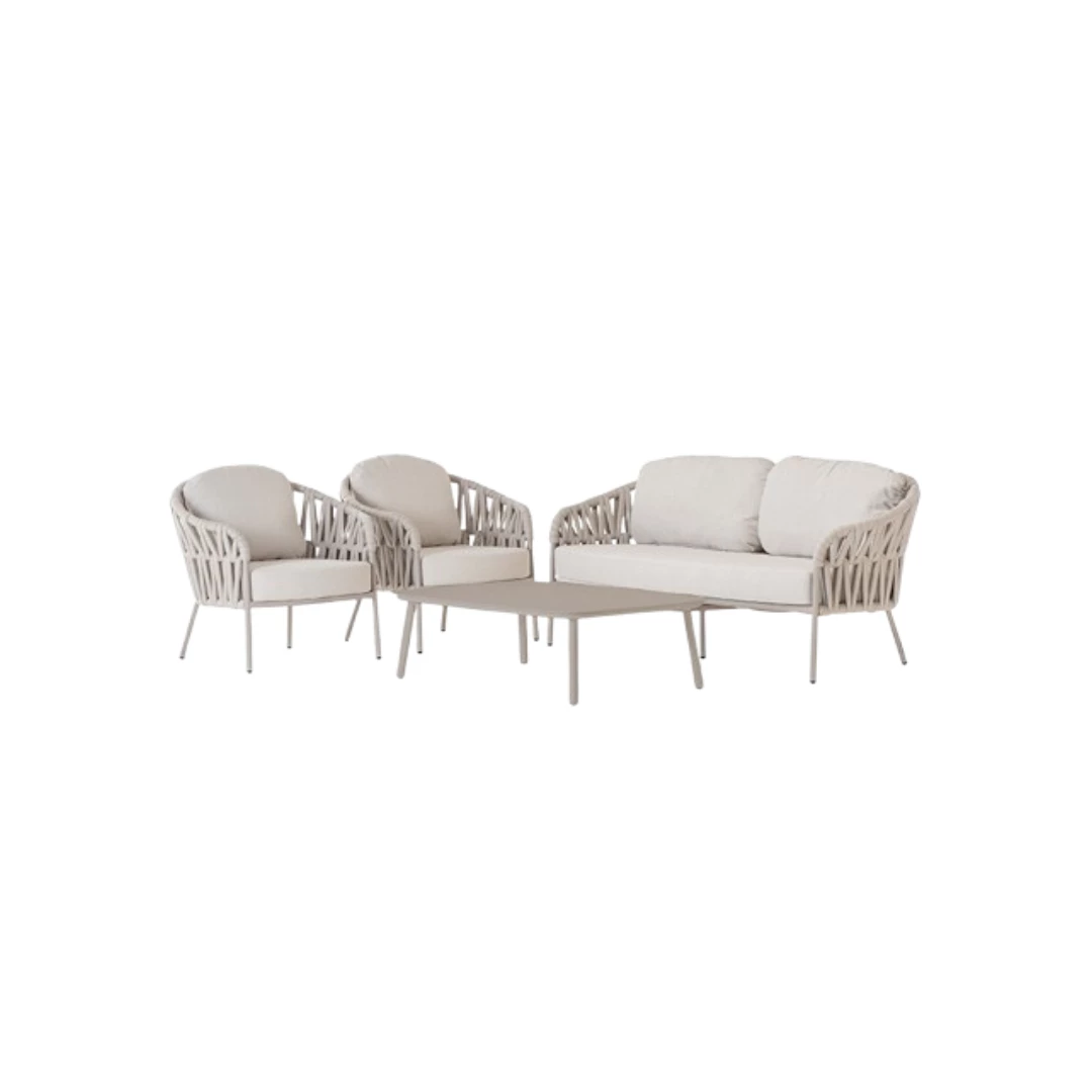 Werten Sie Ihren Außenbereich mit diesem stilvollen und robusten Wohnset auf, das Komfort und Eleganz vereint. Gefertigt aus hochwertigem Aluminium und veredelt mit Polyester- und Gummiseil, bietet es ein modernes Design und ist gleichzeitig äußerst langlebig. Das Set umfasst ein geräumiges Sofa, zwei bequeme Lounge-Sessel und einen eleganten Tisch mit Aluminiumplatte – perfekt zum Entspannen oder für gesellige Stunden. Die Kissen sind aus hochwertigem Olefin-Gewebe mit wasserabweisenden Eigenschaften gefertigt und somit ideal für den Einsatz im Freien bei unterschiedlichen Wetterbedingungen. Zusätzlich enthält das Set einen Victory-Sandstuhl und einen Atol-Sessel, die für weitere Sitzgelegenheiten und Flexibilität sorgen. Dieses Komplettset wird zum Festpreis angeboten und ist nicht als Einzelartikel erhältlich – die perfekte All-in-One-Lösung für Ihren Außenbereich.