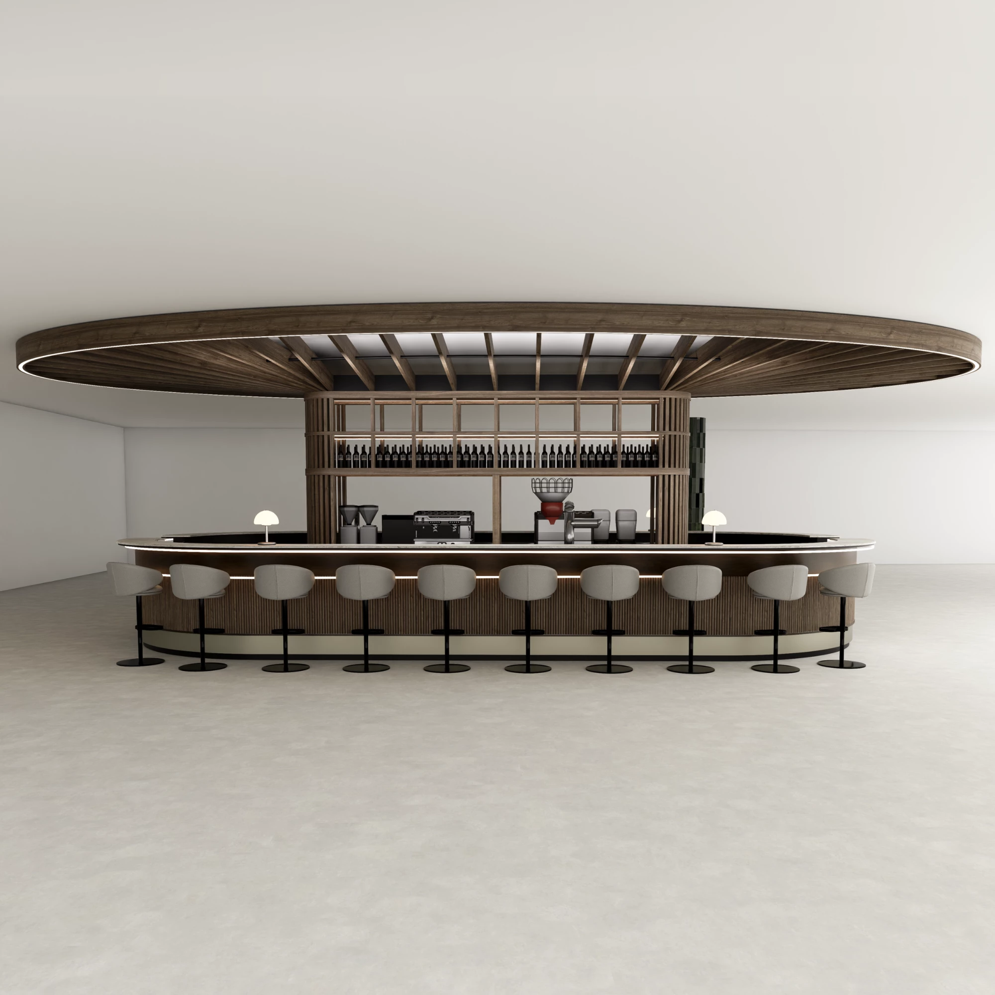 Ein maßgeschneidertes, modernes Barkonzept, exklusiv für Cafés und Restaurants. Es vermittelt ein warmes, elegantes und dezent luxuriöses Ambiente. Das Design wird durch 3D-Visualisierungen ergänzt, die eine präzise Darstellung des finalen Konzepts ermöglichen.