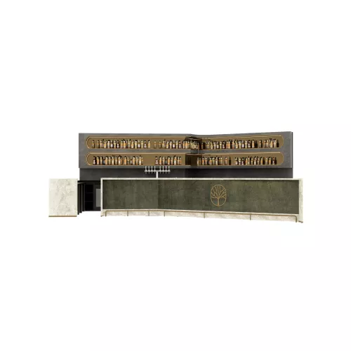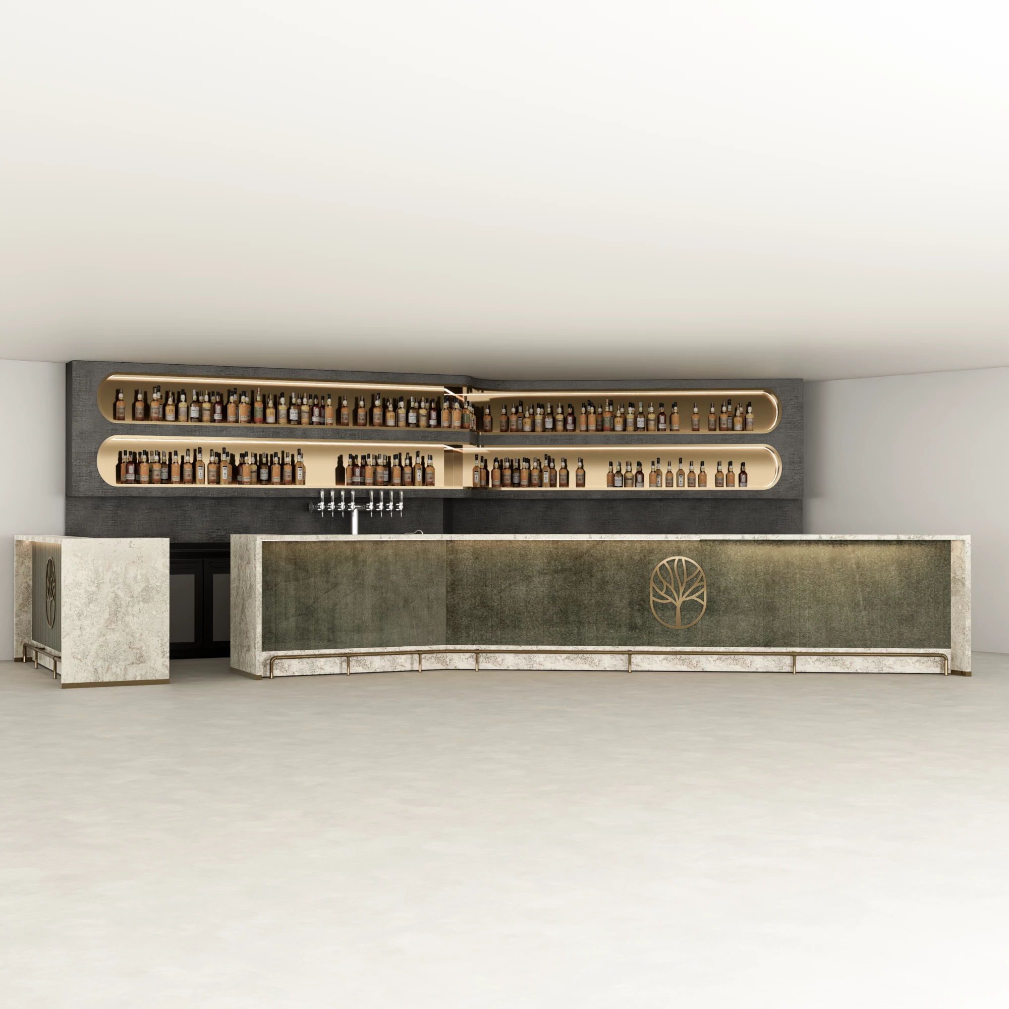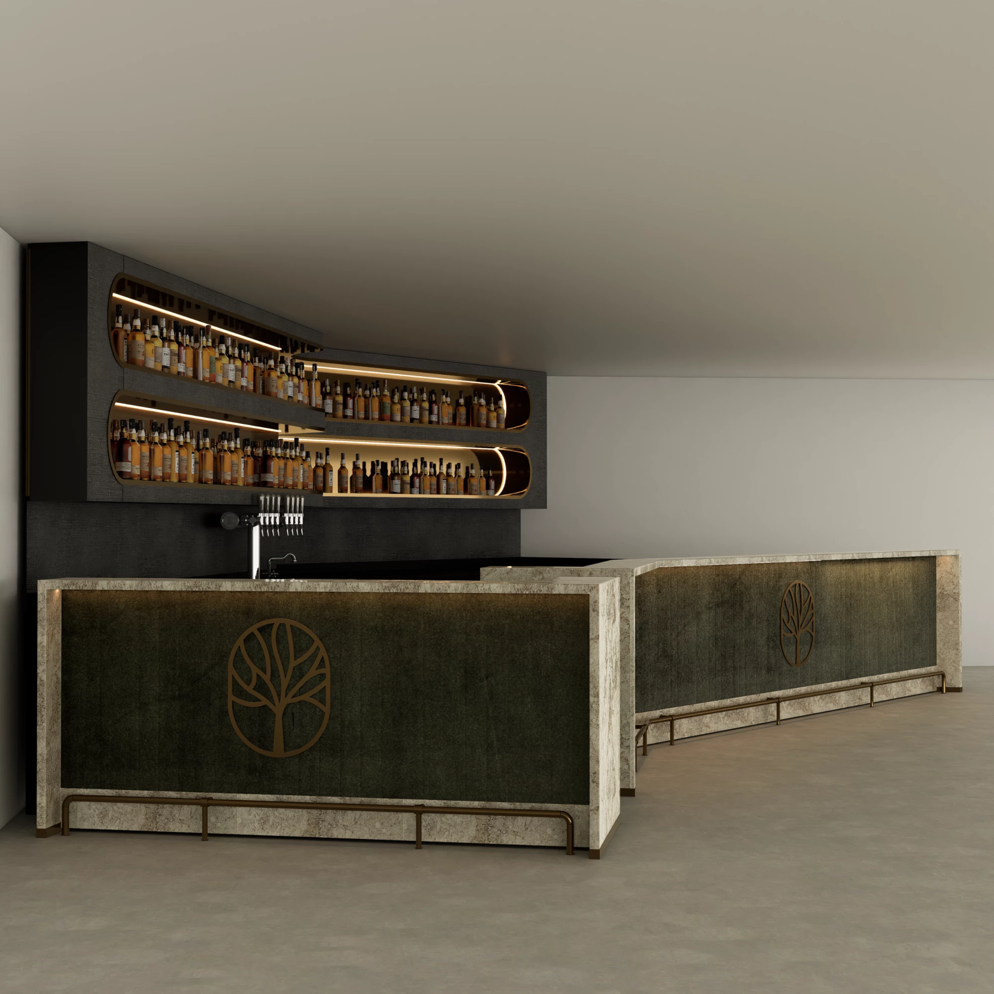 Diese maßgefertigte Bar überzeugt mit einem modernen, klaren Layout, einer edlen Steinoptik und beleuchteten Regalen. Die Fronttheke wird durch ein dekoratives Emblem akzentuiert und verleiht dem Raum eine markante Identität. Hinter der Bar sorgen schwebende Regale mit integrierter Beleuchtung für eine elegante Präsentation der Flaschen und verbinden Funktionalität mit ausdrucksstarkem Design. Ideal für moderne Gastronomiekonzepte, vereint diese Bar Langlebigkeit, Raffinesse und Markencharakter.