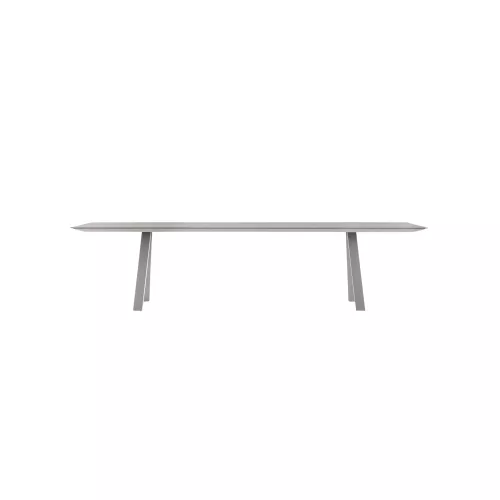 Tisch mit robusten Trestle-Beinen aus Stahl und einer Tischplatte, die von einem Rahmen aus extrudiertem Aluminium getragen wird. Die Materialkombination sorgt für Stabilität und einen modernen Industrie-Look.