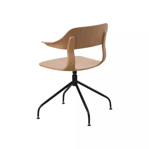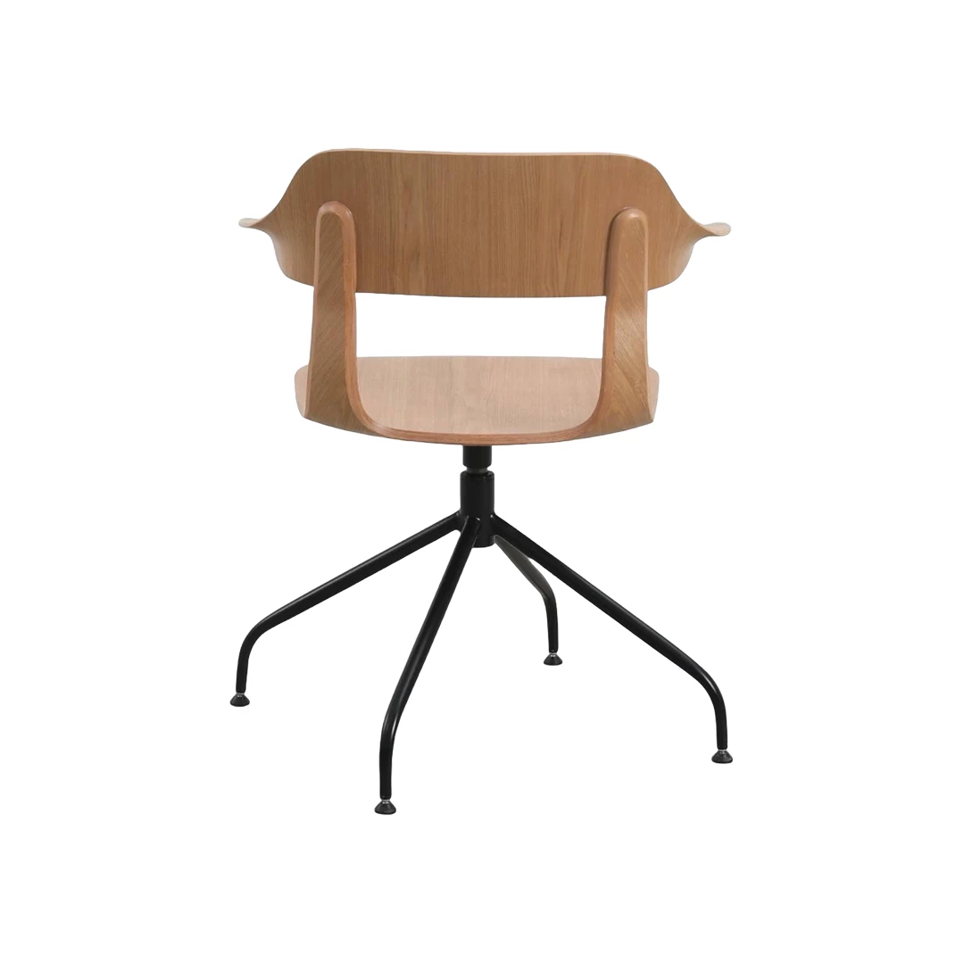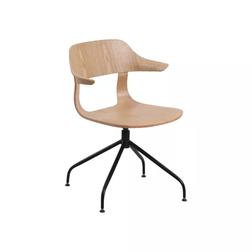 Stilvoller Stuhl mit geschwungener Holzschale und integrierten Armlehnen. Das offene Rückendesign sitzt auf einem schwarzen Spider-Metallgestell – eine harmonische Verbindung von Ästhetik und Stabilität. Ideal für moderne HoReCa-Umgebungen.
