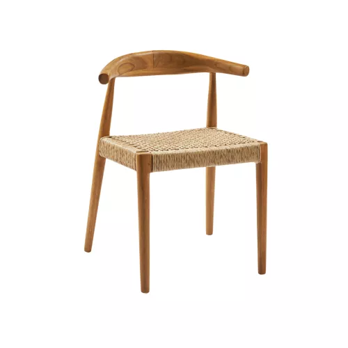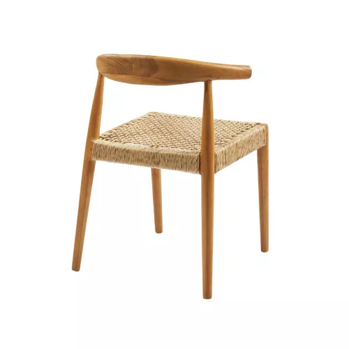 Outdoor-Stuhl aus robustem Teakholz, mit Sitz und Rückenlehne aus hochwertigem synthetischem Rattan. Wetterbeständig, ideal für Terrasse, Garten oder Balkon. Maße: 55x49x76 cm.