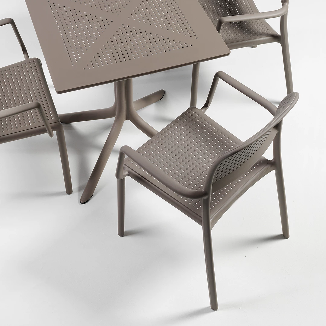 Der Clip-Tisch ist die ideale Lösung für professionelle Essbereiche im Freien und vereint Langlebigkeit, Stil und Funktionalität. Dank seines robusten Polypropylen-Rahmens hält er auch starker Beanspruchung in gut besuchten Restaurants, Cafés, Bistros und auf Terrassen stand. Erhältlich in einer breiten Palette eleganter Farben – Weiß, Anthrazit, Tortora, Agave und Tabak – fügt sich Clip nahtlos in jedes Dekor ein und schafft eine stimmige und einladende Atmosphäre. Seine leichte und dennoch robuste Konstruktion ermöglicht eine einfache Positionierung bei gleichzeitiger Stabilität und langlebiger Leistung. Damit eignet er sich perfekt für gewerbliche Umgebungen, in denen Zuverlässigkeit und Ästhetik gleichermaßen wichtig sind.