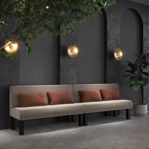 Donald with Legs ist eine individuell gefertigte Essbank mit einem robusten Buchenholzgestell und hochdichtem Schaumstoff für dauerhaften Komfort. Eine große Auswahl an professionellen Bezugsstoffen ermöglicht eine perfekte Anpassung an jede Gastronomieeinrichtung.