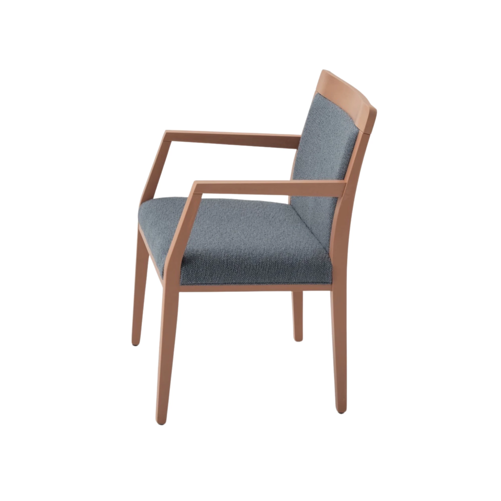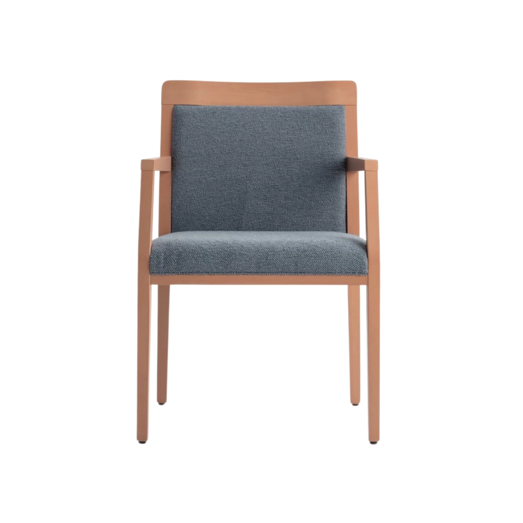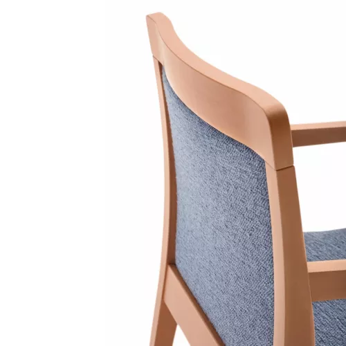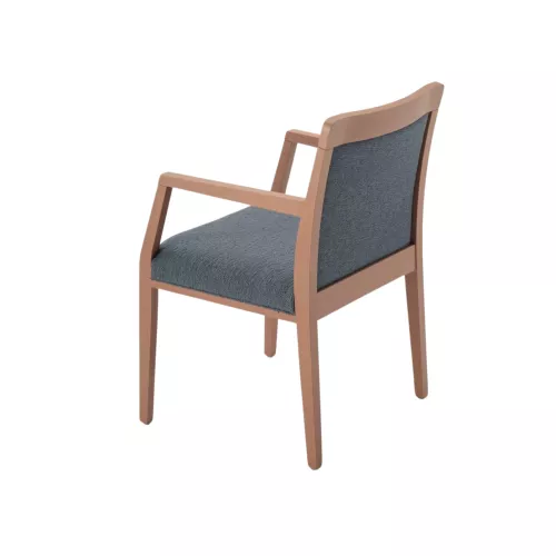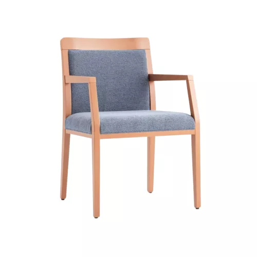 Dubai A ist ein eleganter gepolsterter Stuhl mit Armlehnen sowie gepolsterter Sitzfläche und Rückenlehne. Der Buchenholzrahmen ist mit Polyurethanlack beschichtet und in mehreren Farbtönen erhältlich. Mit Stoff oder Kunstleder bezogen, eignet er sich ideal für Restaurants oder andere HORECA-Bereiche und passt sich durch viele Optionen jedem Designstil an.