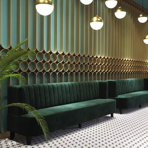 Faith Sofa ist eine stilvolle Restaurantbank mit hochdichtem Schaumstoff, der für besonderen Komfort und hohe Langlebigkeit sorgt. Sie ist in einer breiten Auswahl an professionellen Stoffen oder Kunstleder erhältlich. Auf Wunsch kann die Bank auch mit eigenem Stoff bezogen und individuell nach Kundenvorgaben gefertigt werden. Im Preis enthalten sind ein schwarzer oder standardmäßiger Melamin-Sockel oder Beine aus Birkenholz, mit einem Stoffverbrauch von 3,80 m und 1 m für die gepolsterte Rückseite.