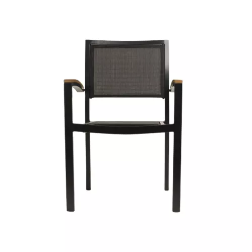 Der George Black / Black Textilene Stuhl vereint Langlebigkeit und Stil und wurde speziell für Terrassenrestaurants, Cafés und Bistros entwickelt. Sein robustes Aluminiumgestell (22221,8 mm) ist pulverbeschichtet und dadurch besonders langlebig und UV-beständig – ideal für den Außenbereich. Der Textilene-Bezug ist atmungsaktiv, schnelltrocknend und bietet hohen Sitzkomfort. Armlehnen sorgen für zusätzlichen Komfort und Entspannung. Dank seiner Stapelbarkeit lassen sich bis zu 24 Stühle platzsparend übereinanderlegen – perfekt, um in ruhigeren Zeiten Platz zu sparen. Ob Sie einen modernen Essbereich im Freien gestalten oder einen bestehenden aufwerten möchten: Der George Silver / Black Textilene Stuhl vereint Funktionalität, Komfort und zeitloses Design.