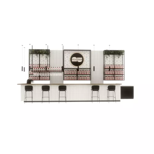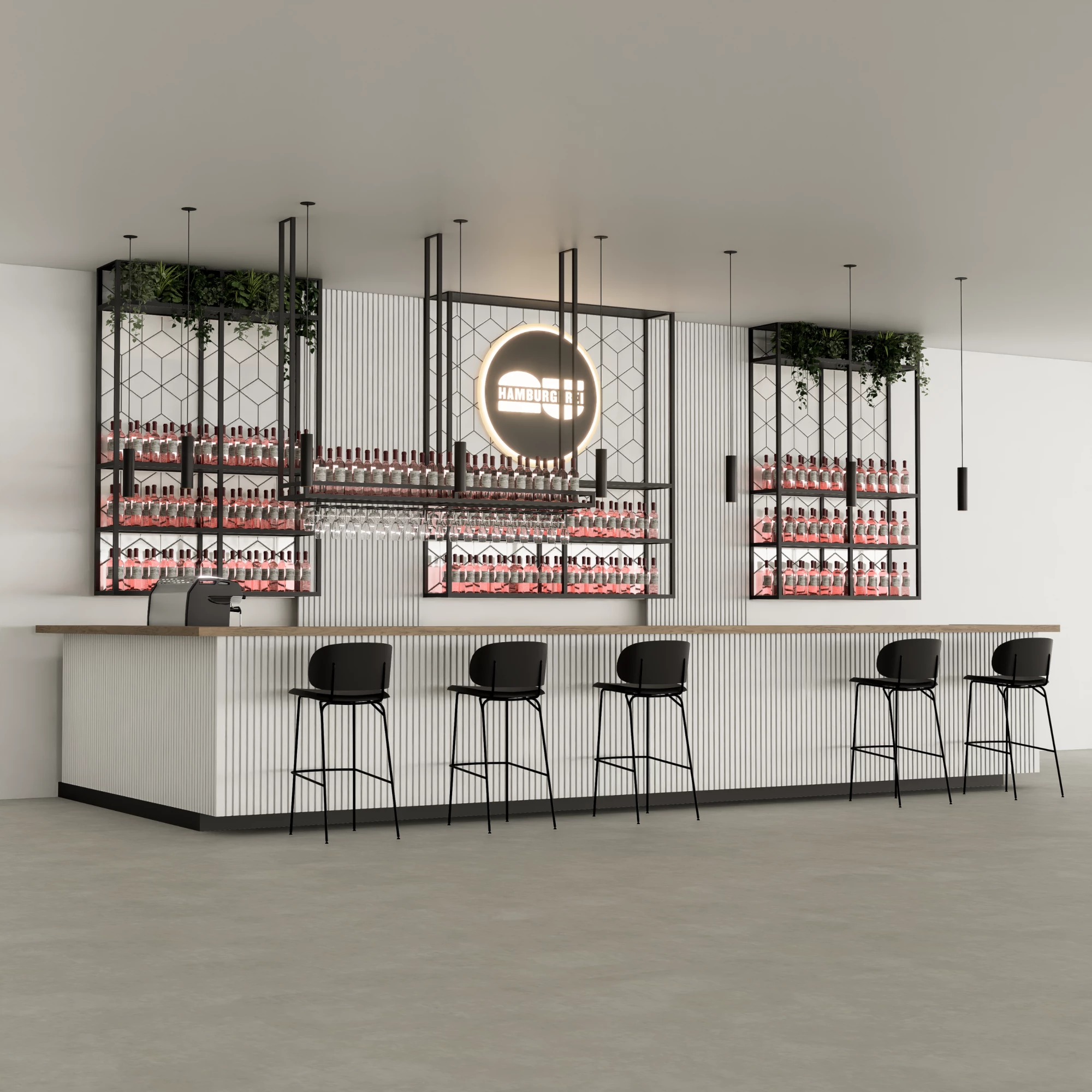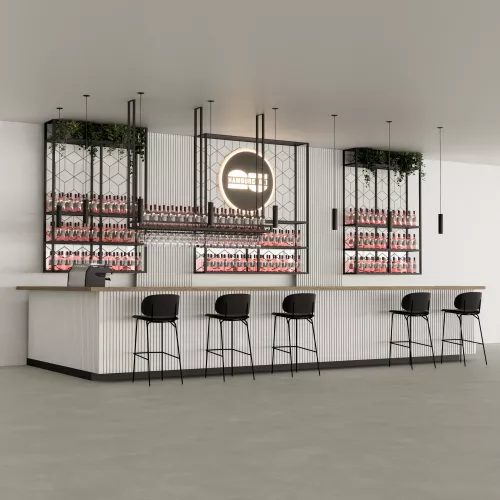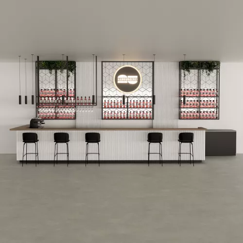 Ein frisches und zeitgemäßes Barkonzept, das sich durch klare Linien, natürliche Wärme und skulpturale Texturen auszeichnet.