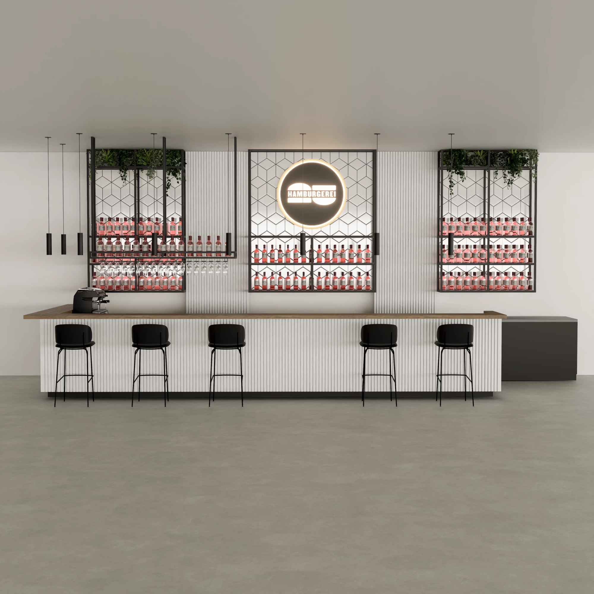 Ein Logo aus schwarzem Metall mit integrierter LED-Beleuchtung rundet das Gesamtbild ab – ein raffinierter Blickfang, der Identität, Atmosphäre und einen Hauch von unaufdringlichem Luxus verleiht.