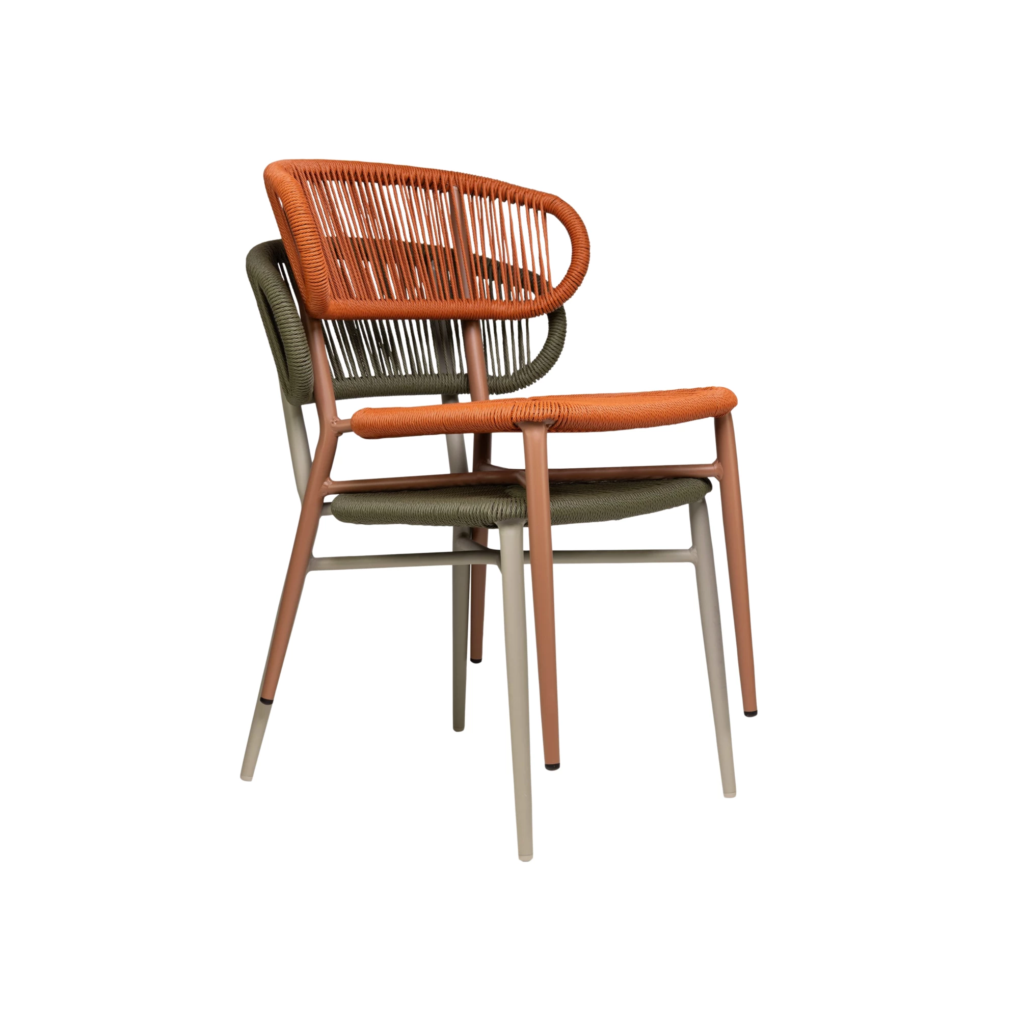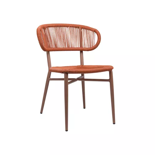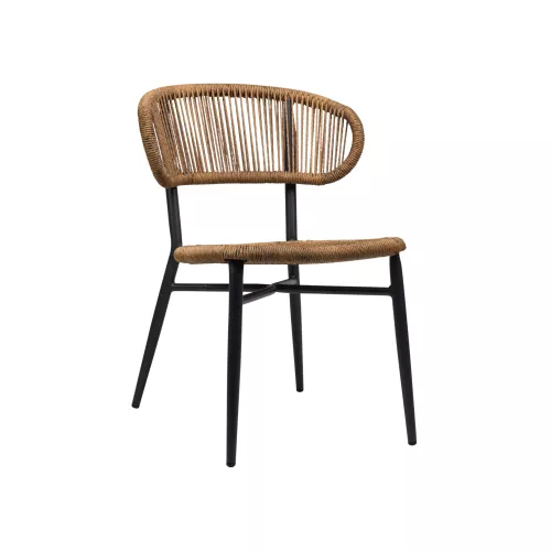 Sitz und Rückenlehne bestehen aus geflochtenem Rattan und werden von einem leichten Aluminiumrahmen mit anthrazitfarbener Pulverbeschichtung getragen. Die Konstruktion ist robust und gleichzeitig leicht zu handhaben. Dank der Stapelbarkeit eignet sich der Stuhl ideal für effiziente Lagerung und flexible Terrassengestaltung.