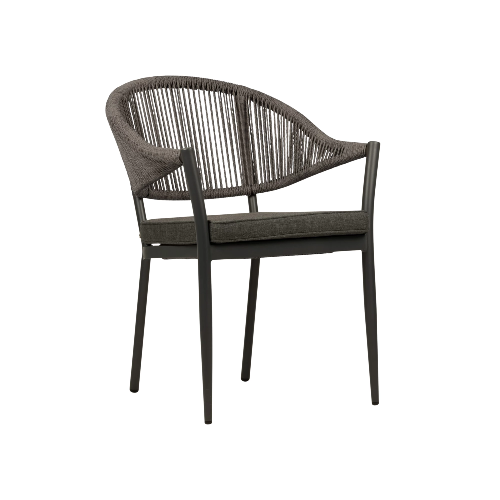 Dieser Terrassenstuhl wurde für moderne Außenbereiche im Gastronomiebereich entwickelt. Er verfügt über ein stabiles Aluminiumgestell in Anthrazit und eine UV-beständige Seilgeflecht-Bespannung. Die offene Flechtstruktur sorgt für eine zeitgemäße Optik und hohe Widerstandsfähigkeit im Außenbereich.