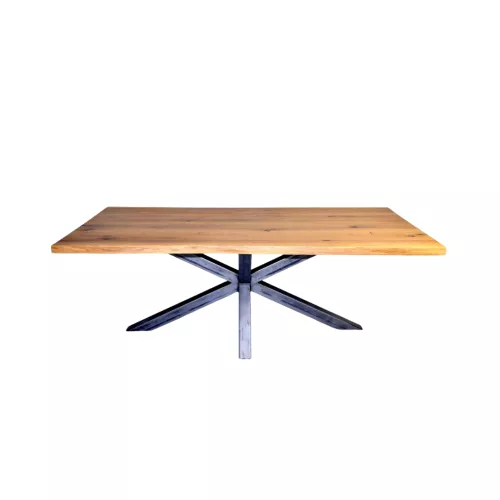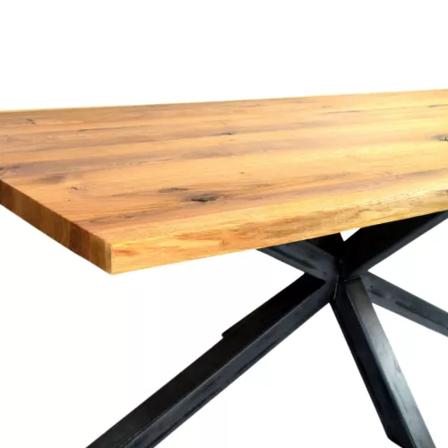 Tisch mit 2,8 cm dicker Tischplatte aus rustikaler Eiche und doppeltem X-Stahlgestell (8x8 cm). Gestell aus unbehandeltem Stahl, Eichenplatten gehobelt und geschliffen. In verschiedenen Größen erhältlich, Höhe bis zur Tischplatte: 78 cm.